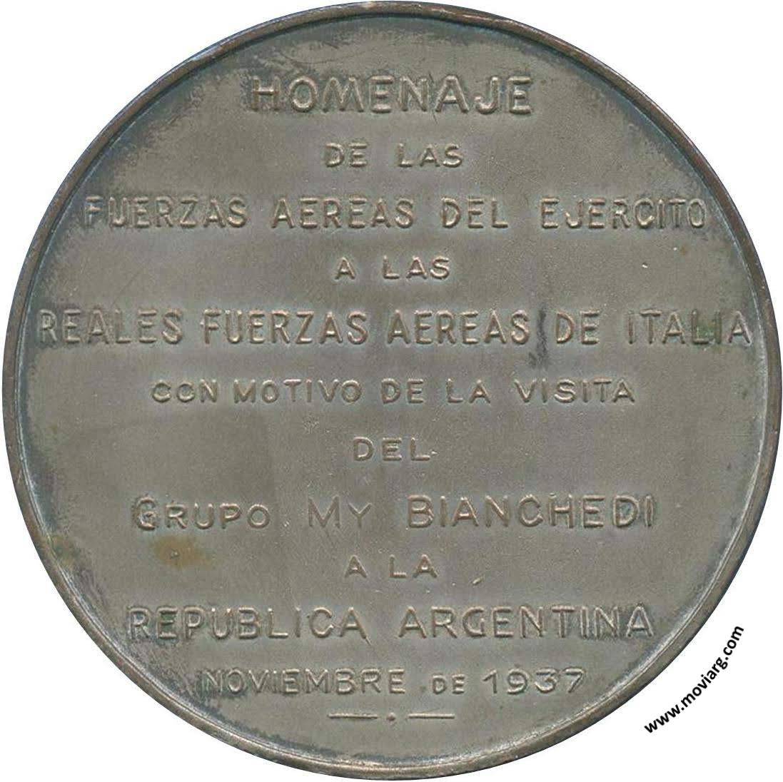 Anverso: Firma: A. CUSERTI Reverso: HOMENAJE / DE LAS / FUERZAS AEREAS DEL EJERCITO / A LAS / REALES FUERZAS AEREAS DE ITALIA / CON MOTIVO DE LA VISITA / DEL / GRUPO MY BIANCHEDI / A LA / REPUBLICA ARGENTINA / NOVIEMBRE DE 1937 Canto: Humberto Burzio: "Buenos Aires en la medalla" 1981 p301. Referencia: BURZIO-897 | |
