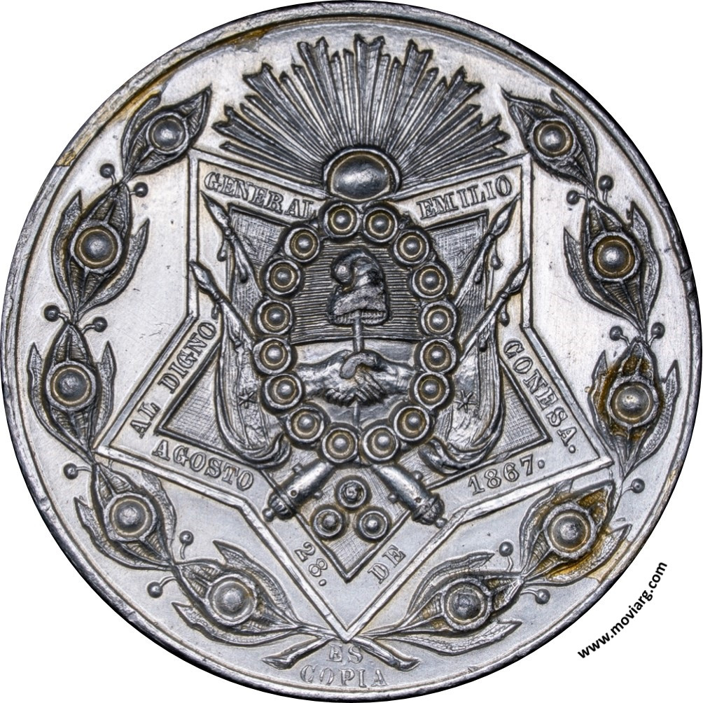 RP Numis Anverso: AL DIGNO / GENERAL / EMILIO / CONESA. / AGOSTO / 28. / DE / 1867. Firma: ES / COPIAReverso: CORDOBA AGRADECIDA / AL VALOR Y LA CLEMENCIA. Firma: S. CACCIA / ROSARIO Referencia: | |