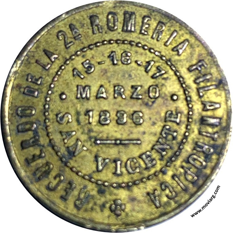 Colección Magnin Anverso: PATROCINADA POR LA SOCIEDAD COSMOPOLITA / DE S. MUTUOSReverso: RECUERDO DE LA 2A. ROMERIA FILANTROPICA / 15 - 16 - 17 / MARZO / 1896 / SAN VICENTE Referencia: | |
