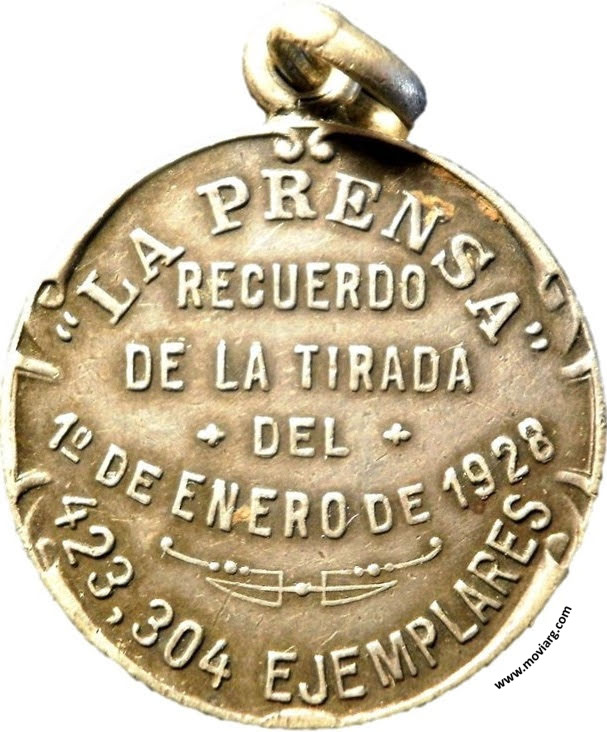 Anverso: VERITAS · JUSTITIA · HUMANITAS. Firma: C. ROSSI Reverso: " LA PRENSA " / RECUERDO / DE LA TIRADA / DEL / 1° DE ENERO DE 1928 / 423,304 EJEMPLARES Canto: Liso. PLATA Referencia: | |