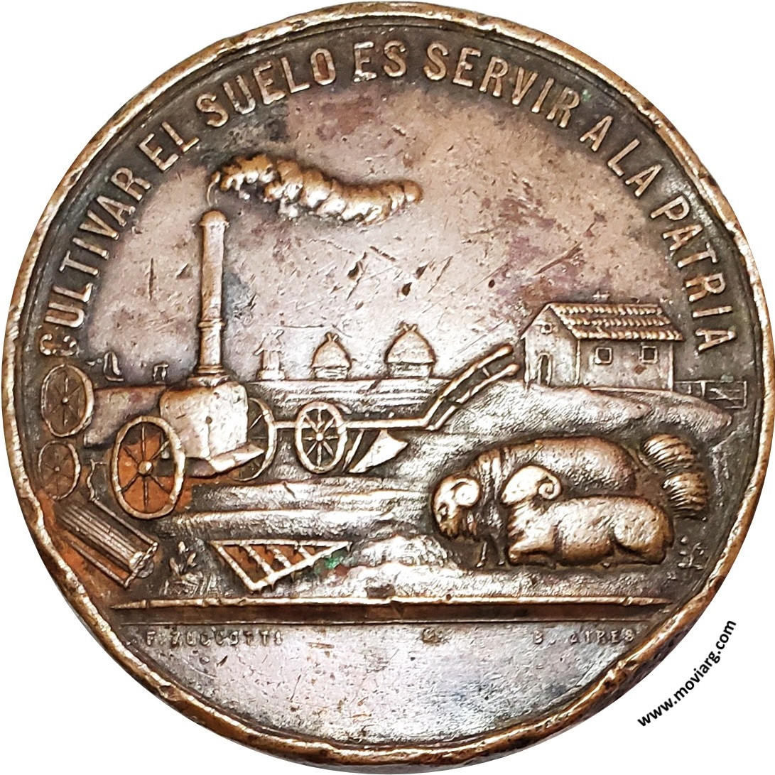 Anverso: CULTIVAR EL SUELO ES SERVIR A LA PATRIA. Firma: F. ZUCCOTTI / B. AIRES Reverso: LA SOCIEDAD RURAL ARGENTINA / EN LA / EXPOSICION / DE MENDOZA / DE 1885 Referencia: | |