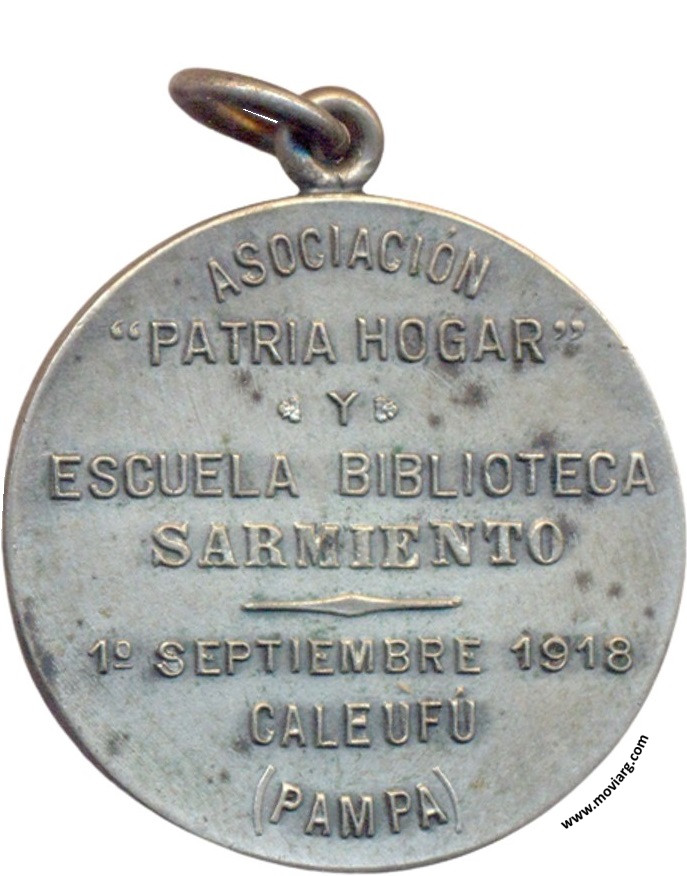 Anverso: Firma: C. Y AF. ROSSI Reverso: ASOCIACIÓN / " PATRIA HOGAR " / Y / ESCUELA BIBLIOTECA / SARMIENTO / 1° SEPTIEMBRE 1918 / CALEUFÚ / ( PAMPA ) Referencia: | |