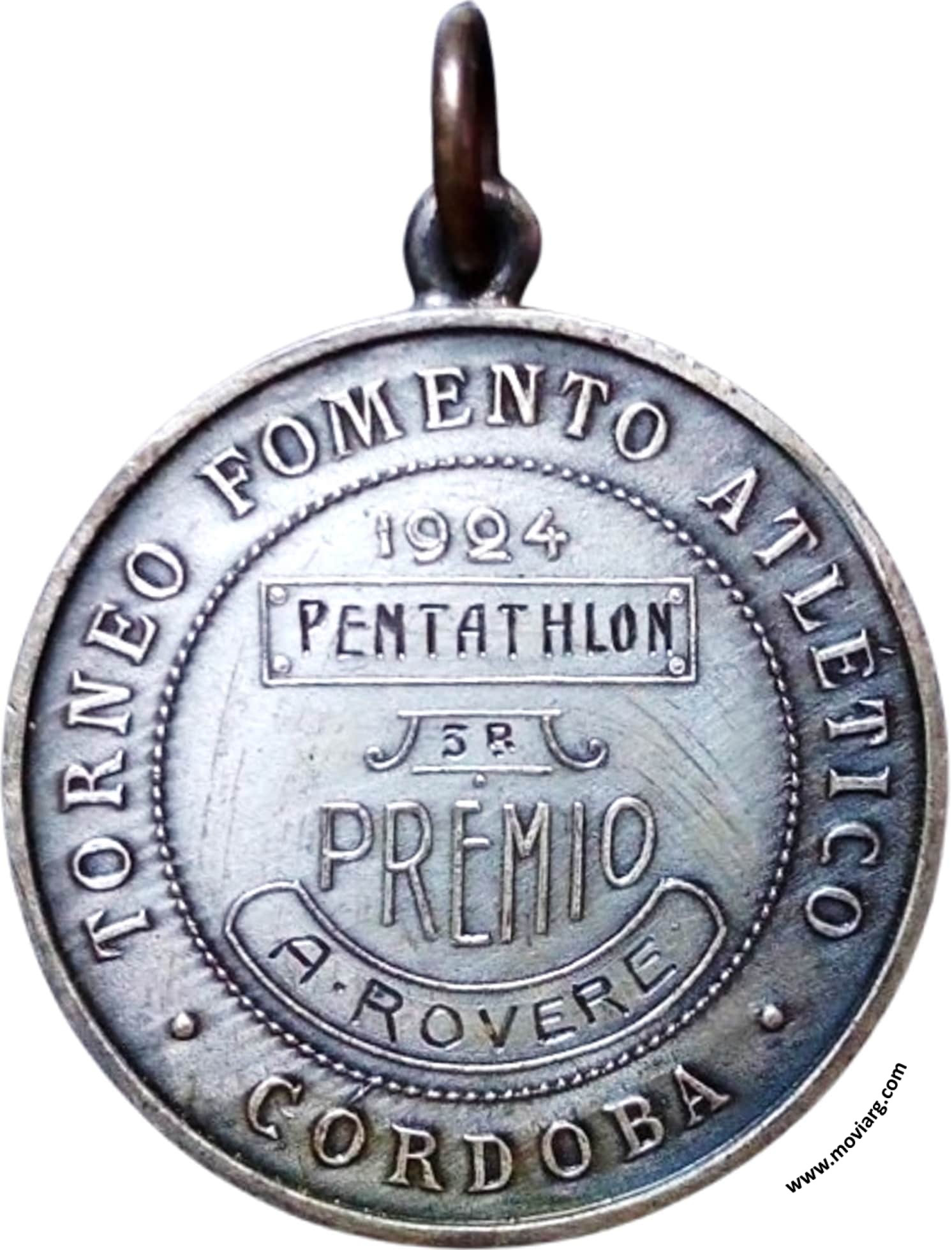 Anverso: CLUB PEDESTRE " VELOCIDAD Y RESISTENCIA ". Firma: PASTORINO Y SALA Reverso: TORNEO FOMENTO ATLÉTICO / CÓRDOBA / 1924 / [ PENTATHLON ] / [ 3R. ] / PREMIO / [ A. ROVERE ] Referencia: | |