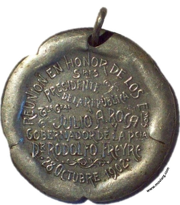 Anverso: JOCKEY CLUB / ROSARIO / INAUGURACION / OBRAS / DEL PUERTO. Firma: BELLAGAMBA Y ROSSI Reverso: REUNION EN HONOR DE LOS EMOS. / SRES. / PRESIDENTE / DE LA REPÚBLICA / TTE. GRAL. / JULIO A. ROCA / Y / GOBERNADOR DE LA PCIA. / DR. RODOLFO FREYRE / 28 OCTUBRE 1902 Referencia: | |