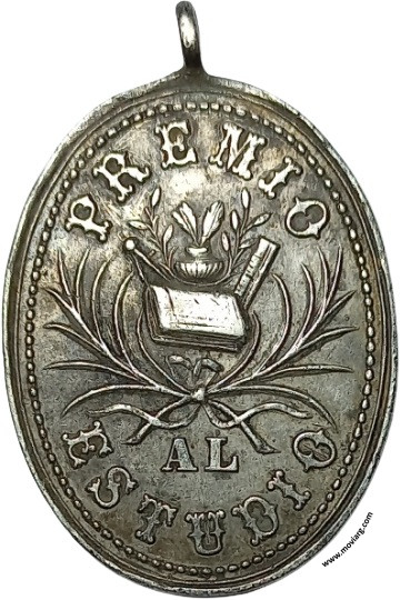 | Año: (1887) Premio al Mérito y Aplicación Metal: Plata - Peso: 10.14gr - Módulo: 25.59x38.09mm - Espesor: 1.82mm - Rotación: 12hrs Grabador: Rosario Grande | |