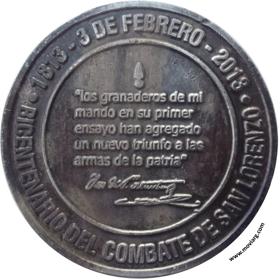 Anverso: BAUTISMO DE FUEGO / REGIMIENTO DE GRANADEROS A CABALLO " GRL. SAN MARTIN " Reverso: BICENTENARIO DEL COMBATE DE SAN LORENZO / 1813 - 3 DE FEBRERO - 2013 / " LOS GRANADEROS DE MI / MANDO EN SU PRIMER / ENSAYO HAN AGREGADO / UN NUEVO TRIUNFO A LAS / ARMAS DE LA PATRIA " / JOSE DE SAN MARTIN Referencia: | |