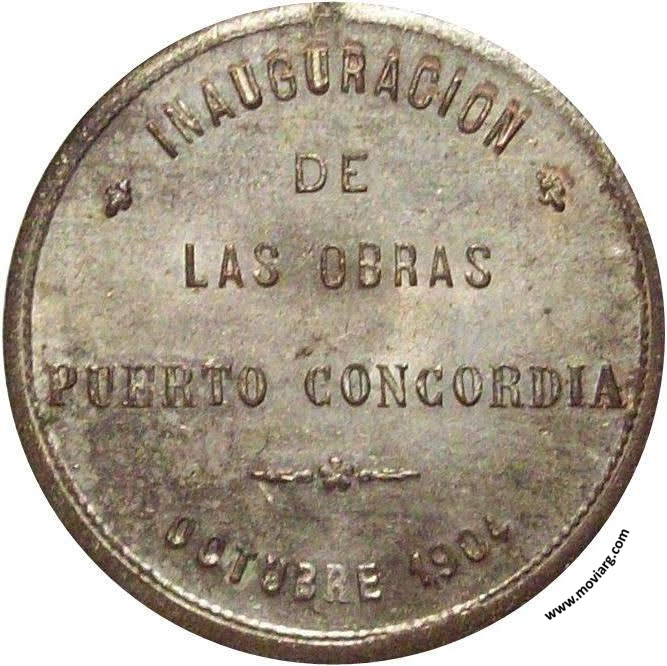 Anverso: FUERTE POR EL TRABAJO. Firma: BELLAGAMBA Y ROSSI Reverso: INAUGURACION / DE / LAS OBRAS / PUERTO CONCORDIA / OCTUBRE 1904 Referencia: | |