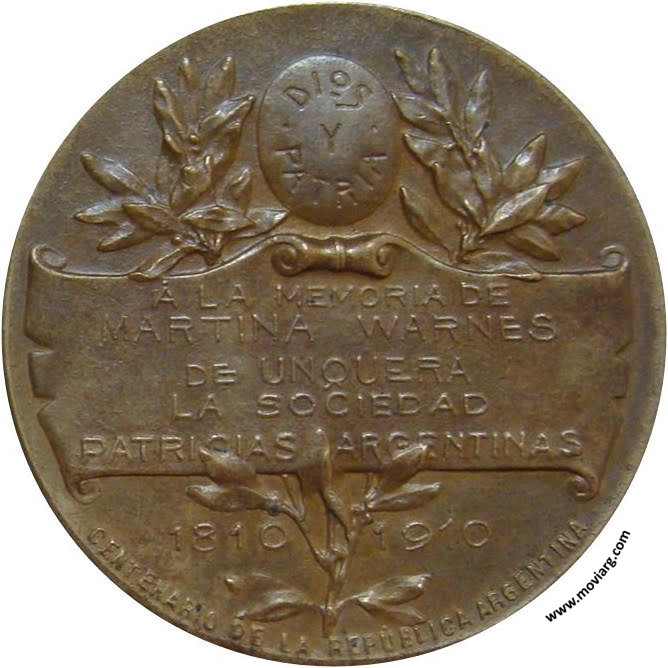 Anverso: NACIÓ / 1781 Reverso: DIOS / Y / PATRIA / Á LA MEMORIA DE / MARTINA WARNES / DE UNQUERA / LA SOCIEDAD / PATRICIAS ARGENTINAS / 1810 1910 / CENTENARIO DE LA REPÚBLICA ARGENTINA Referencia: | |