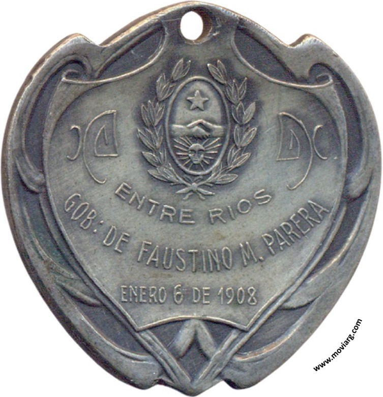 Anverso: COLOCACION DE LA PIEDRA / FUNDAMENTAL / ESCUELA SUPERIOR MIXTA / GUALEGUAYCHÚ. Firma: HORTA Y CIA. Reverso: ENTRE RIOS / GOB: DE FAUSTINO M. PARERA / ENERO 6 DE 1908 Canto: Liso. PLATA Referencia: | |