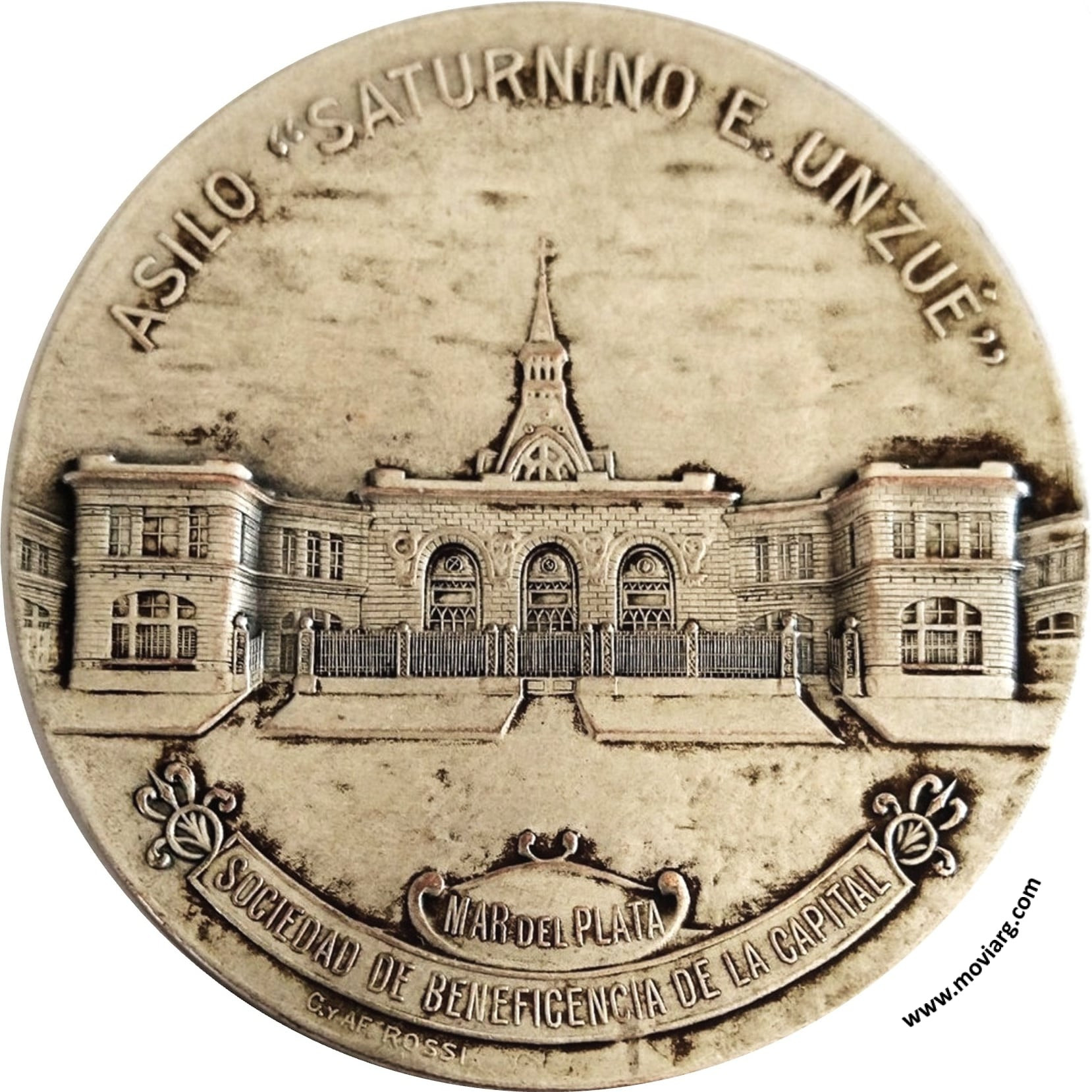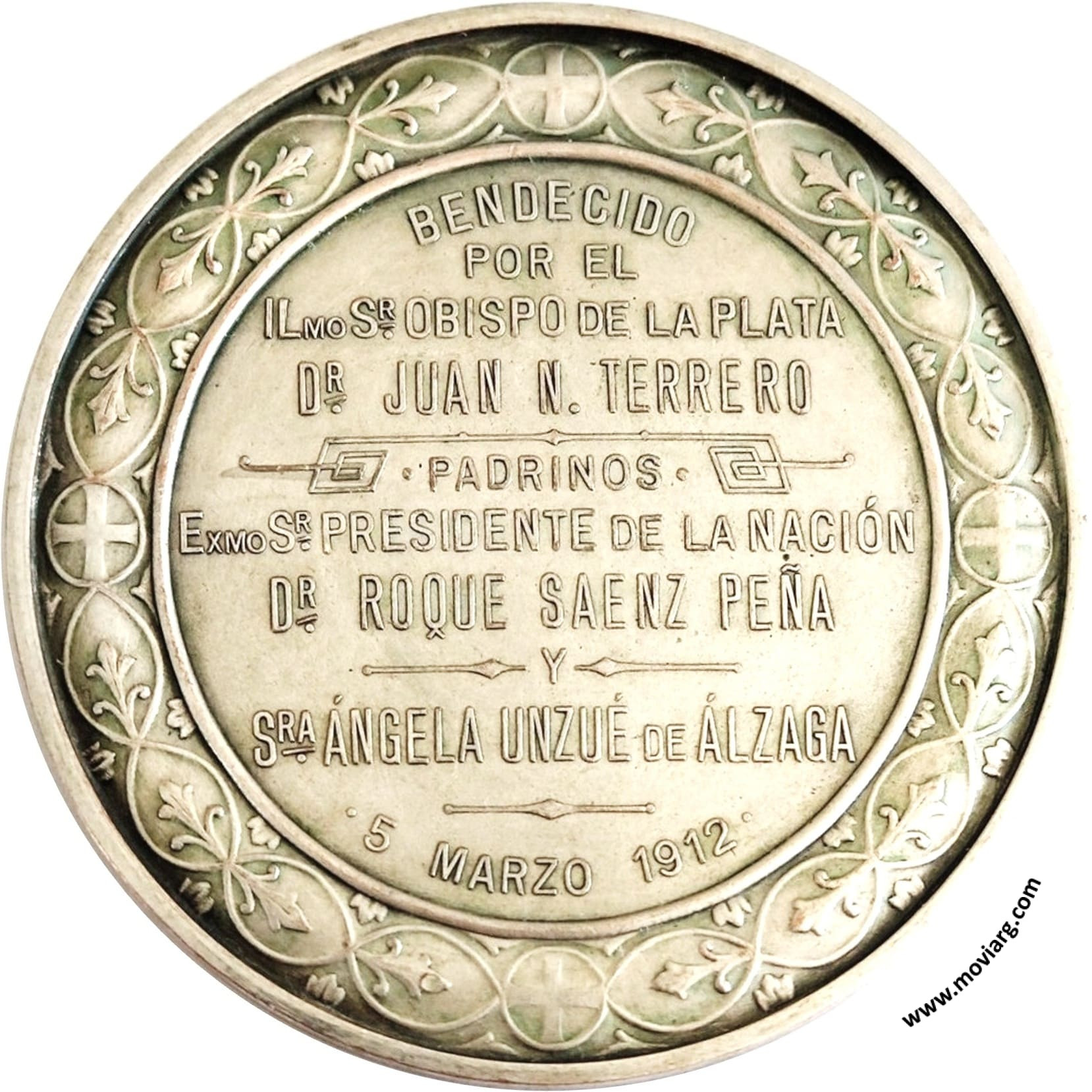 Anverso: ASILO " SATURNINO E. UNZUÉ " / MAR DEL PLATA / SOCIEDAD DE BENEFICENCIA DE LA CAPITAL. Firma: C. Y AF. ROSSI Reverso: BENDECIDO / POR EL / ILMO. SR. OBISPO DE LA PLATA / DR. JUAN N. TERRERO / PADRINOS / EXMO. SR. PRESIDENTE DE LA NACIÓN / DR. ROQUE SAENZ PEÑA / Y / SRA. ÁNGELA DE UNZUÉ DE ÁLZAGA / 5 MARZO 1912 Referencia: | |