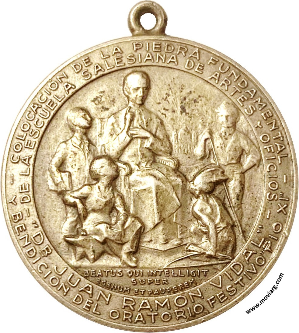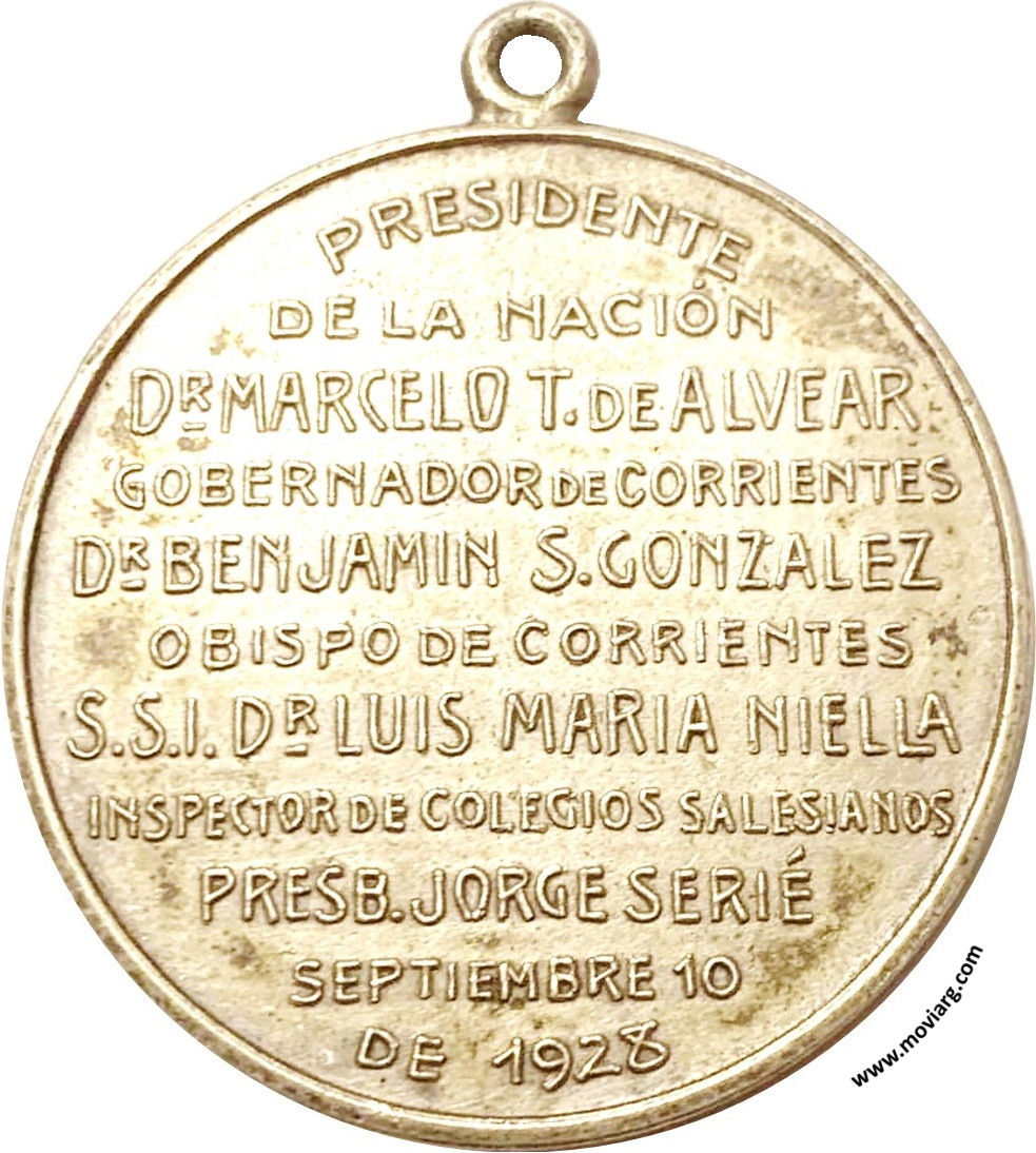 Anverso: COLOCACION DE LA PIEDRA FUNDAMENTAL / Y BENDICION DEL ORATORIO FESTIVO " PIO XI " / DE LA ESCUELA SALESIANA DE ARTES Y OFICIOS / " DR. JUAN RAMON VIDAL " / BEATUS QUI INTELLIGIT / SUPER / EGENUM ET PAUPEREM Reverso: PRESIDENTE / DE LA NACIÓN / DR. MARCELO T. DE ALVEAR / GOBERNADOR DE CORRIENTES / DR. BENJAMIN S. GONZALEZ / OBISPO DE CORRIENTES / S.S.I. DR. LUIS MARIA NIELLA / INSPECTOR DE COLEGIOS SALESIANOS / PRESB. JORGE SERIÉ / SEPTIEMBRE 10 / DE 1928 Referencia: | |