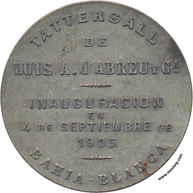 Anverso: EXPOSICION Y VENTA DE REPRODUCTORES Reverso: TATTERSALL / DE / LUIS A. D'ABREU Y CA. / INAUGURACION / EN / 4 DE SEPTIEMBRE DE / 1905 / BAHIA - BLANCA Referencia: | |
