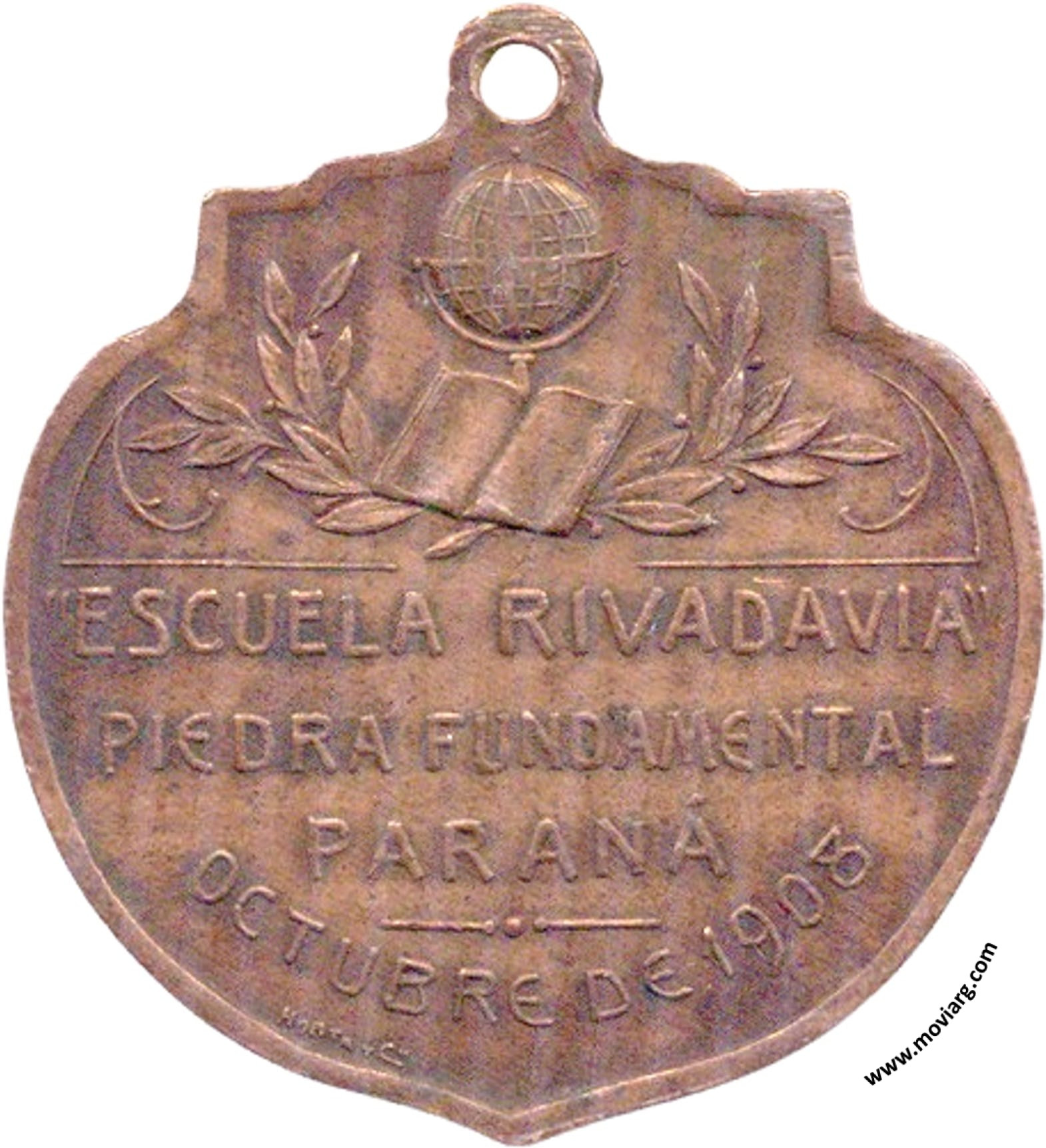 Anverso: " ESCUELA RIVADAVIA " / PIEDRA FUNDAMENTAL / PARANÁ / OCTUBRE DE 1908. Firma: HORTA Y CIA. Reverso: GOBERNADOR / DR. FAUSTINO M. PARERA / DIRECCIÓN GENERAL / Y CONSEJO ADMINISTRATIVO / DE LA ENSEÑANZA / PÚBLICA Referencia: | |
