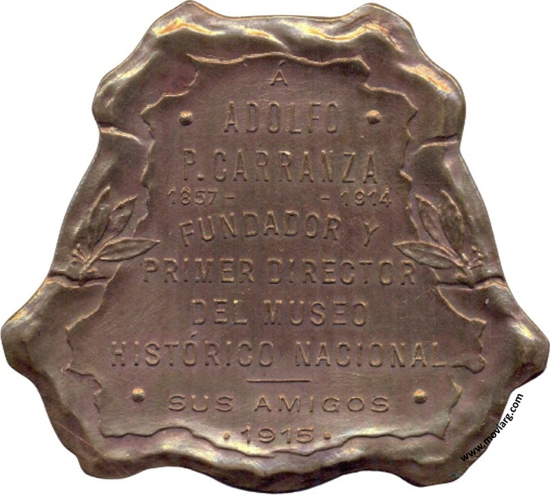Anverso: Firma: CONSTANTE ROSSI Reverso: Á / ADOLFO / P. CARRANZA / 1857 - - 1914 / FUNDADOR Y / PRMER DIRECTOR / DEL MUSEO / HISTÓRICO NACIONAL / SUS AMIGOS / 1915 Referencia: | |