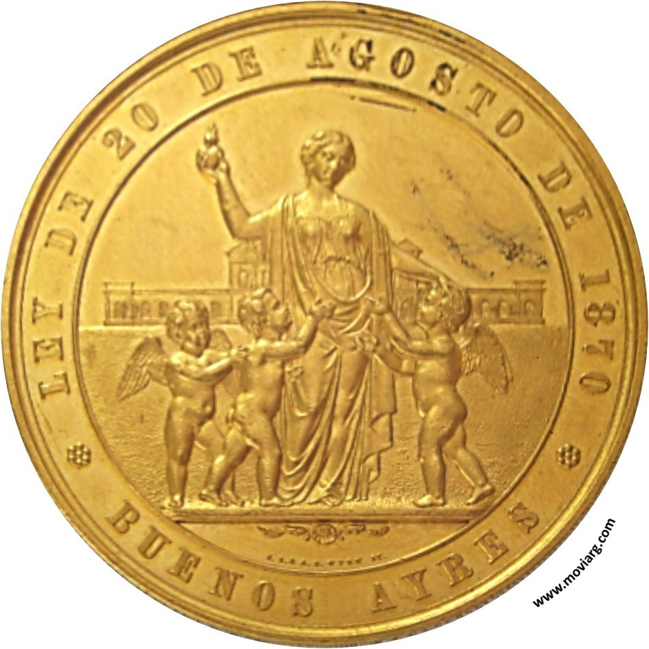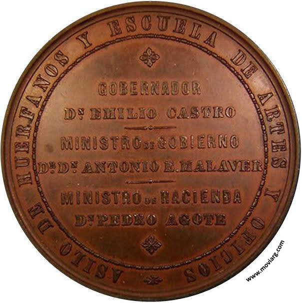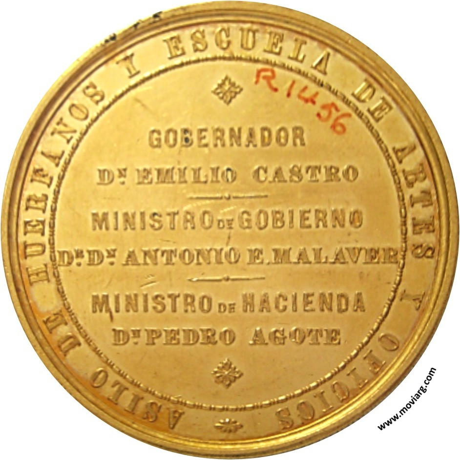 Senip (MHS 259) Anverso: LEY DE 20 DE AGOSTO DE 1870 / BUENOS AYRES. Firma: J.S. & A.B. WYON SC.Reverso: ASILO DE HUERFANOS Y ESCUELA DE ARTES Y OFICIOS / GOBERNADOR / DN. EMILIO CASTRO / MINISTRO DE GOBIERNO / DR. DN. ANTONIO E. MALAVER / MINISTRO DE HACIENDA / DN PEDRO AGOTE Canto: Dr. D. Aurelio Prado y Rojas: "Cátalogo de las monedas y medallas del Museo de Buenos Aires" 1874 p325. Referencia: | |