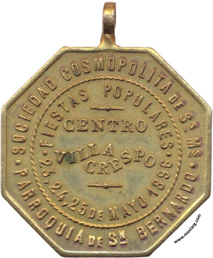 Anverso: Reverso: SOCIEDAD COSMOPOLITA DE SS. MM. / PARROQUIA DE SN. BERNARDO / FIESTAS POPULARES / CENTRO / VILLA / CRESPO / 23, 24, 25 DE MAYO 1896 Referencia: | |