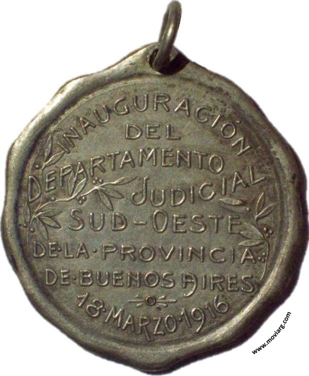 Anverso: Firma: (???) Reverso: INAUGURACIÓN / DEL / DEPARTAMENTO / JUDICIAL / SUD-OESTE / DE LA PROVINCIA / DE BUENOS AIRES / 18 MARZO 1916 Referencia: | |