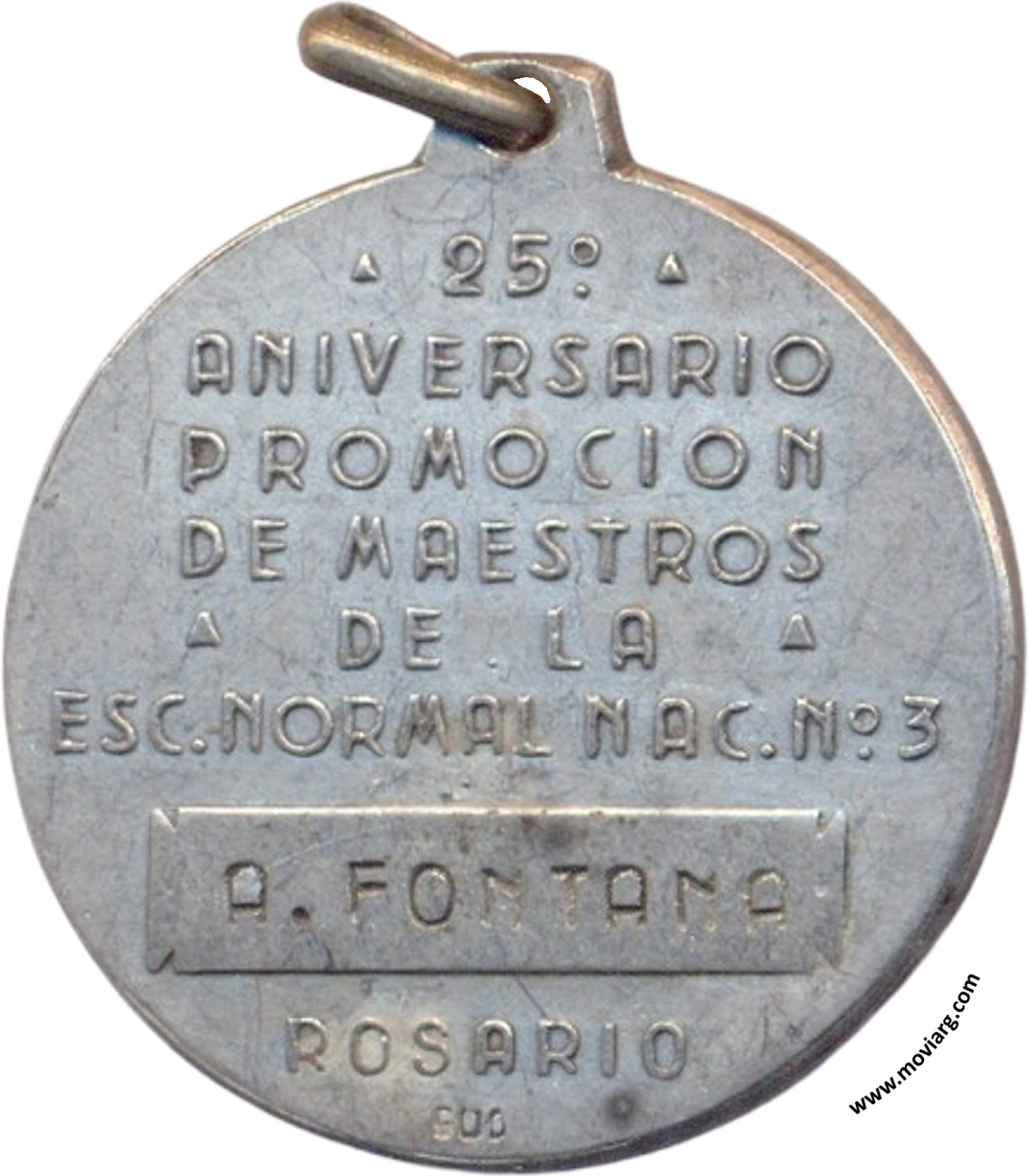 Anverso: 1929 / 1954. Firma: TALL. O. GALLO Reverso: 25° / ANIVERSARIO / PROMOCION / DE MAESTROS / DE LA / ESC. NORMAL NAC. N°3 / [ A. FONTANA ] / ROSARIO. Exergo: [ 900 ] Referencia: | |
