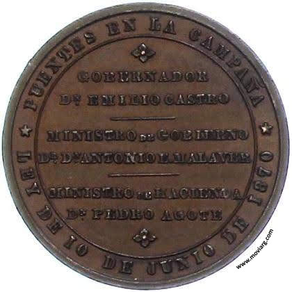 Anverso: BUENOS AYRES / 1871. Firma: J.S. & A.B. WYON SC. Reverso: PUENTES EN LA CAMPAÑA / LEY DE 10 DE JUNIO DE 1870 / GOBERNADOR / DN. EMILIO CASTRO / MINISTRO DE GOBIERNO / DR. DN. ANTONIO E. MALAVER / MINISTRO DE HACIENDA / DN. PEDRO AGOTE Referencia: ROSA-295/68 PRADO-1945 | |