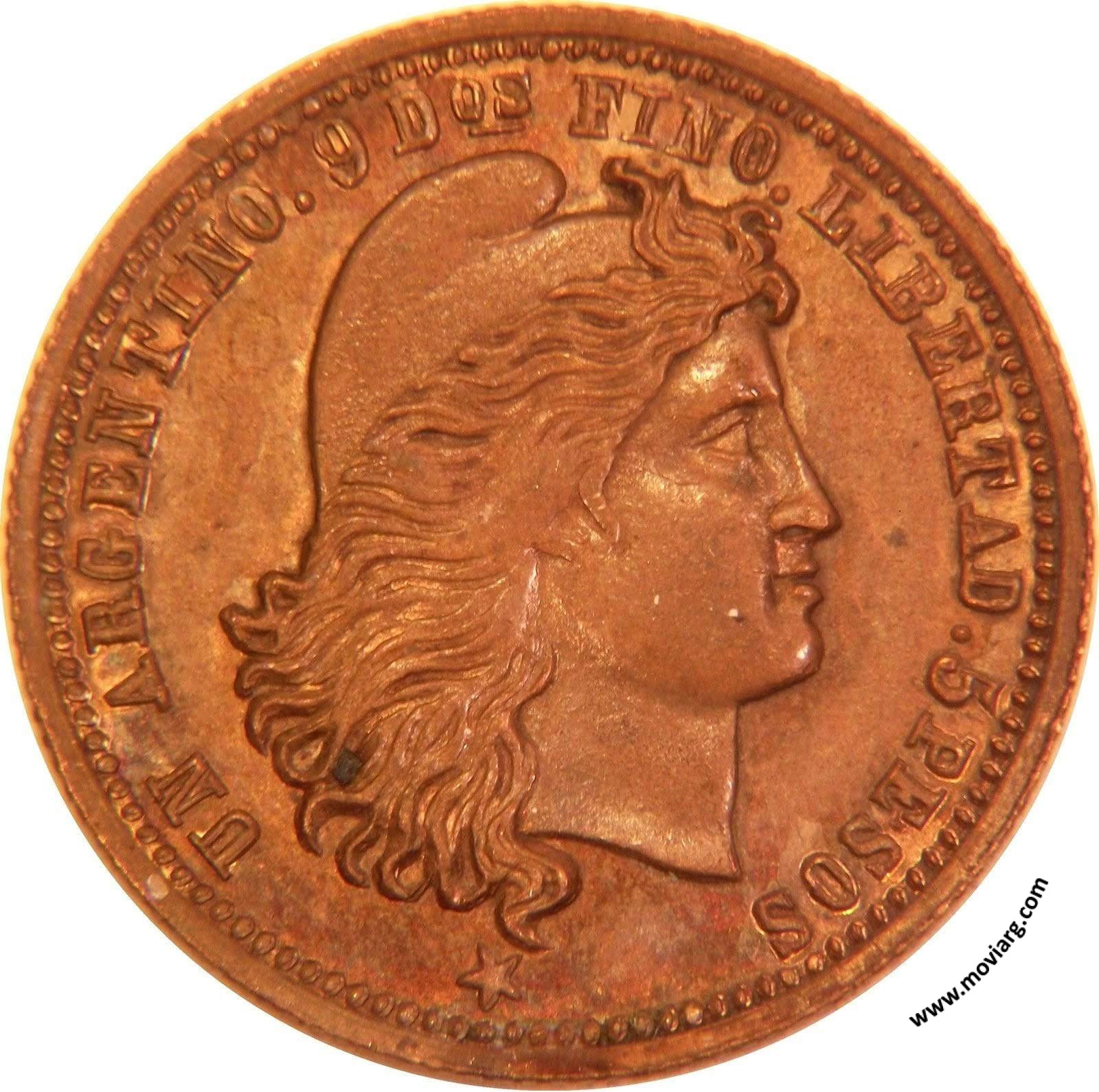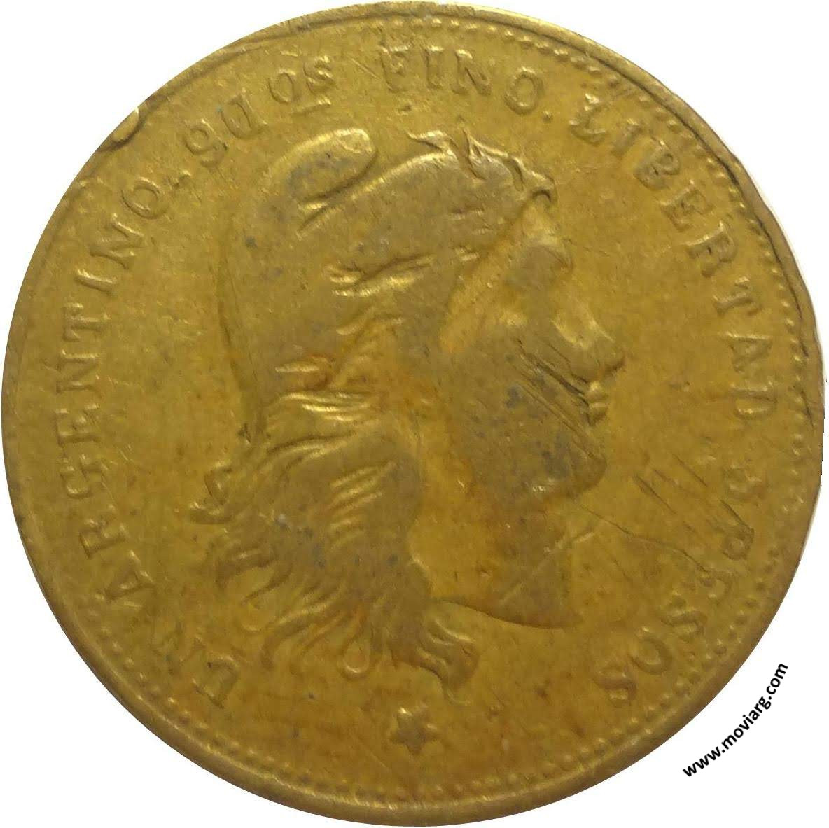 Anverso: UN ARGENTINO. 9 DOS. FINO. LIBERTAD. 5 PESOS Reverso: UNITED STATES OF AMERICA / 5D Referencia: | |