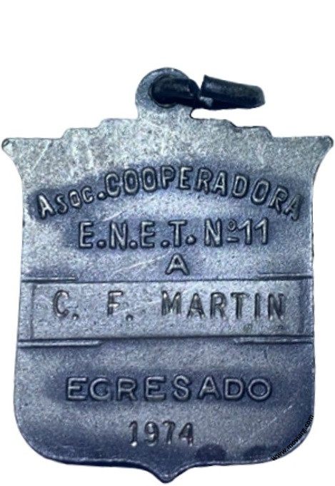 Colección Magnin Anverso: Campo: E / N / E / T / MBReverso: ASOC. COOPERADORA / E.N.E.T. N° 11 / A / [ C. F. MARTIN ] / EGRESADO / [ 1974 ] Referencia: | |