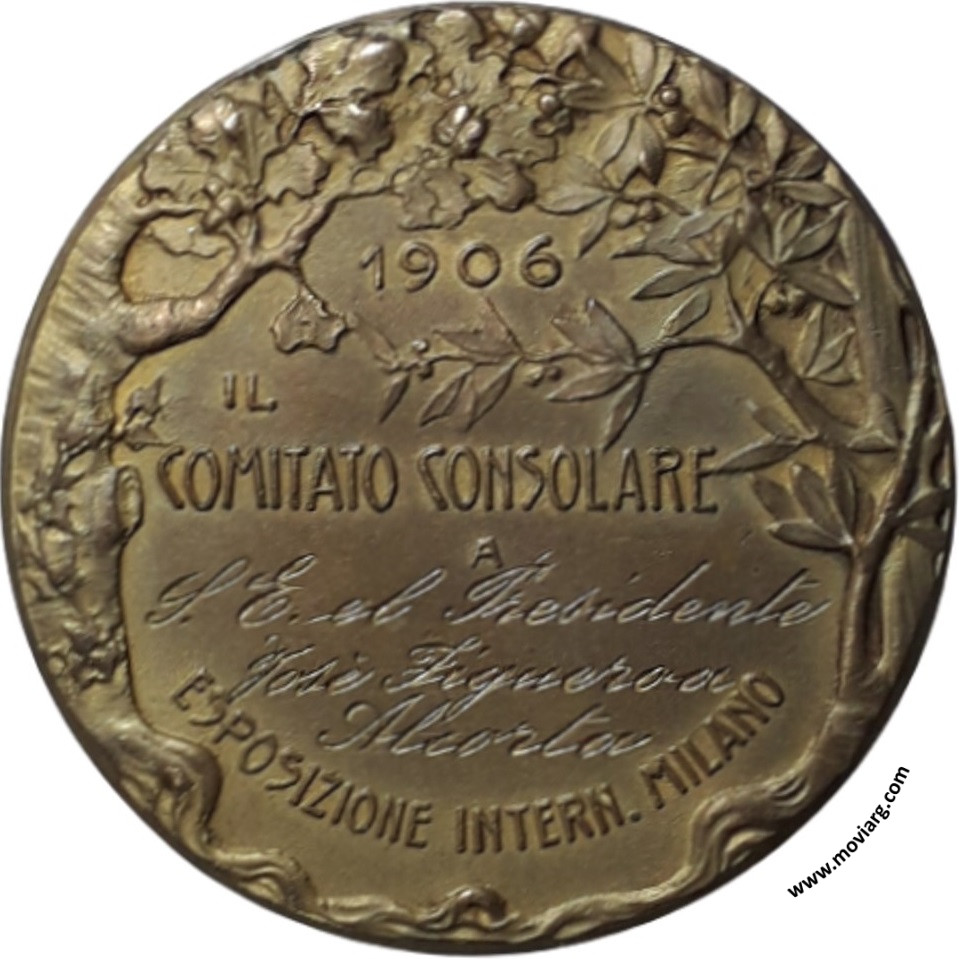 Anverso: AMERICA LATINA. Firma: DONZELLI Reverso: 1906 / IL / COMITATO CONSOLARE / A / [ S. E. EL PRESIDENTE ] / [ JOSÉ FIGUEROA ] / [ ALCORTA ] / ESPOSIZIONE INTERN. MILANO Referencia: | |