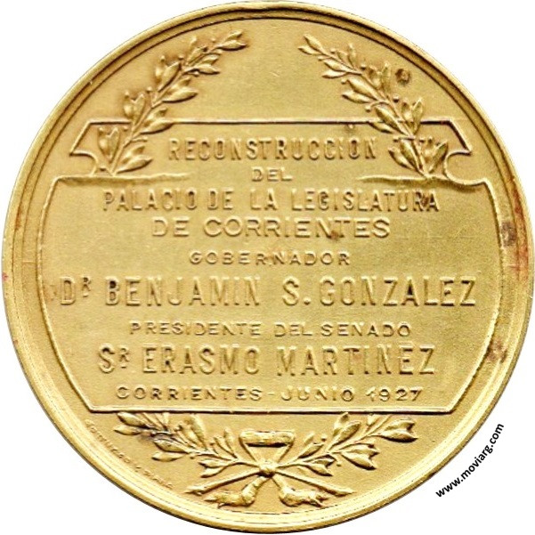 Anverso: DIPUTADOS / SENADORES Reverso: RECONSTRUCCIÓN / DEL / PALACIO DE LA LEGISLATURA / DE CORRIENTES / GOBERNADOR / DR. BENJAMIN S. GONZALEZ / PRESIDENTE DEL SENADO / SR. ERASMO MARTINEZ / CORRIENTES - JUNIO 1927. Firma: GOTTUZZO Y PIANA Referencia: | |