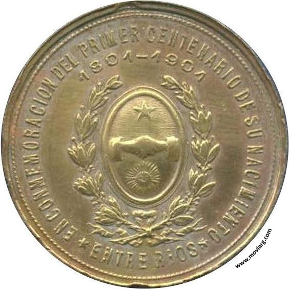 Anverso: EL PUEBLO DE COLON / Y COLONIA SAN JOSÉ (E.R.) / Á SU ILUSTRE FUNDADOR / CTAN. GRAL. JUSTO J. DE URQUIZA. Firma: B. Y R. Reverso: EN CONMEMORACION DEL PRIMER CENTENARIO DE SU NACIMIENTO / ENTRE RIOS / 1801-1901 Referencia: | |