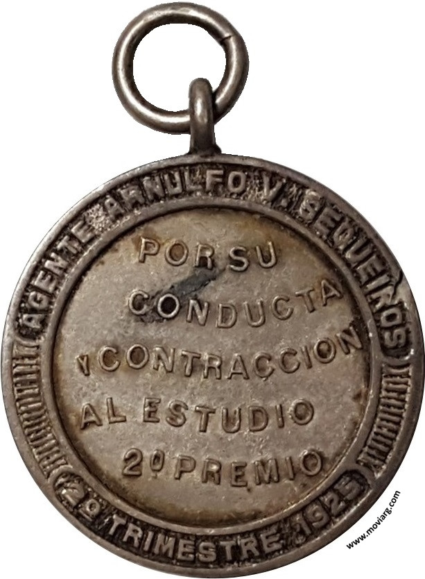 Anverso: REPÚBLICA ARGENTINA / ESCUELA DE POLICIA DE LA CAPITAL Reverso: [ AGENTE ARNULFO V. SEQUEIROS ] / [ 2° TRIMESTRE 1925 ] / POR SU / CONDUCTA / Y CONTRACCION / AL ESTUDIO / 2° PREMIO Referencia: | |