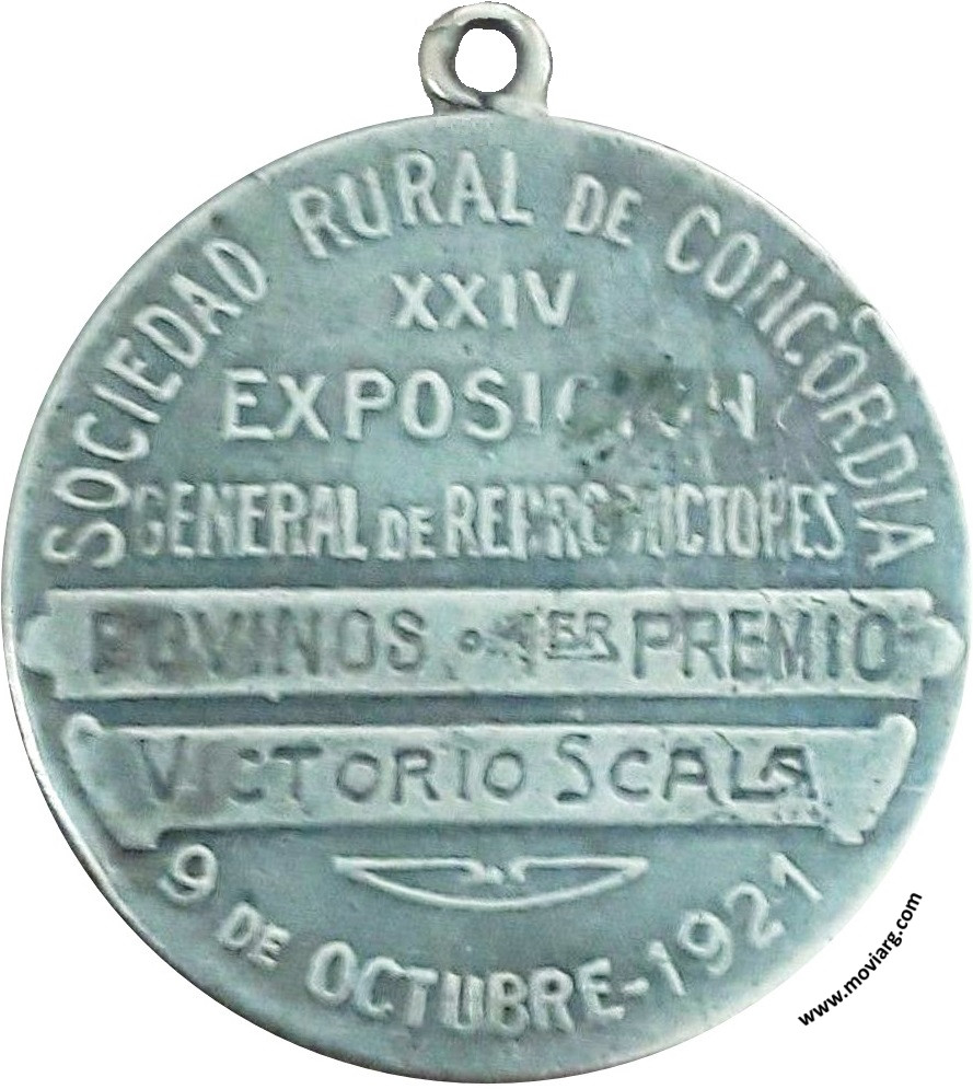 Anverso: SOCIEDAD RURAL / CONCORDIA. Firma: HORTA Reverso: SOCIEDAD RURAL DE CONCORDIA / XXIV / EXPOSICION / GENERAL DE REPRODUCTORES / [ BOVINOS · 1ER. PREMIO ] / [ VICTORIO SCALA ] / 9 DE OCTUBRE - 1921 Referencia: | |
