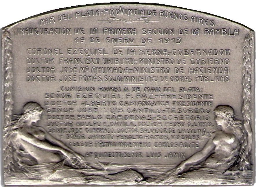 Anverso: Firma: J. GOTTUZZO / Y CA. Reverso: MAR DEL PLATA - PROVINCIA DE BUENOS AIRES / INAUGURACIÓN DE LA PRIMERA SECCIÓN DE LA RAMBLA / 19 DE ENERO DE 1913 / CORONEL EZEQUIEL DE LA SERNA.- GOBERNADOR / DOCTOR FRANCISCO URIBURU.- MINISTRO DE GOBIERNO / DOCTOR JOSÉ MA. AHUMADA.- MINISTRO DE HACIENDA / DOCTOR JOSÉ TOMÁS SOJO .- MINISTRO DE OBRAS PÚBLICAS / COMISION RAMBLA DE MAR DEL PLATA: / SEÑOR EZEQUIEN P. PAZ.- PRESIDENTE / DOCTOR ALBERTO CASTAÑO.- VICE PRESIDENTE / SEÑOR JOSÉ LUIS CANTILO.- TESORERO / DOCTOR PABLO CÁRDENAS.- SECRETARIO / DOCTOR ADOLFO E. DÁVILA, DOCTOR PEDRO O. LURO / SEÑOR JOSE GUERRICO, DOCTOR SALVADOR DE LA COLINA, / Y SEÑOR JACINTO PERALTA RAMOS, VOCALES. / ASESOR TÉCNICO INGENIERO CARLOS AGOTE / ARQUITECTO.- SEÑOR LUIS JAMIN. Referencia: | |