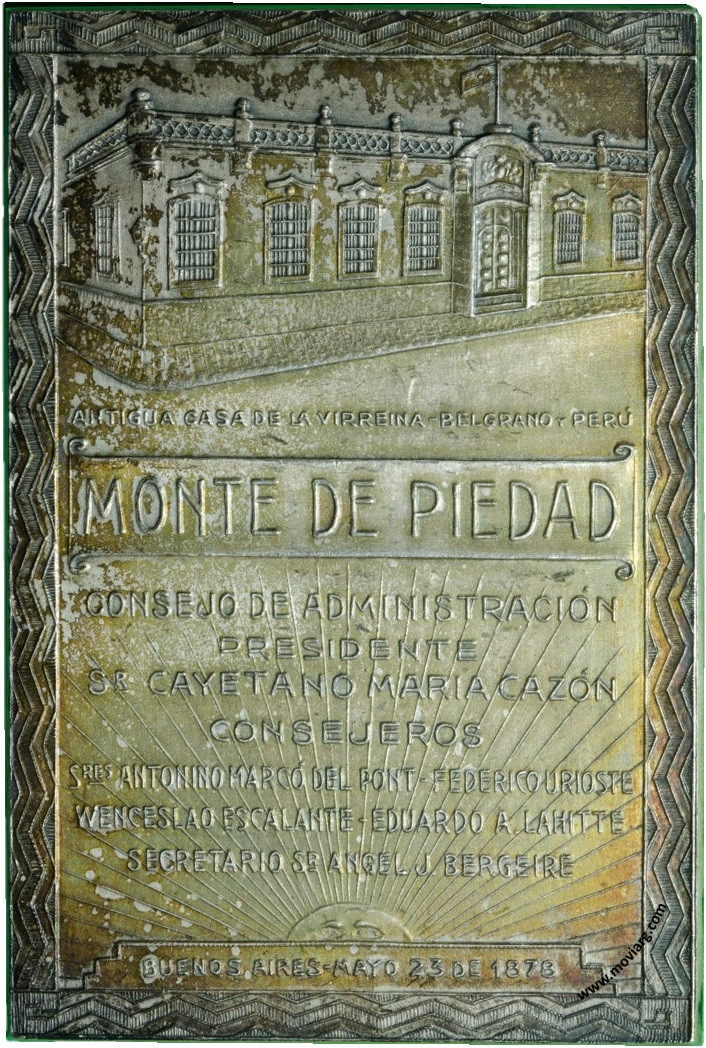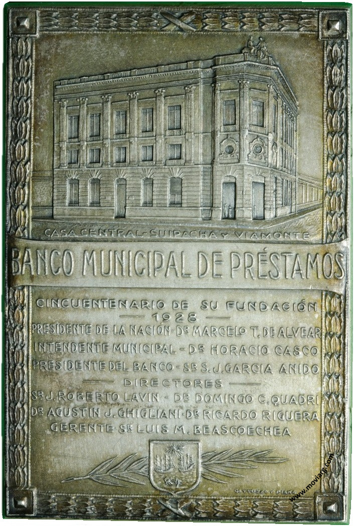 Colección @parryyanumismatico Anverso: CASA CENTRAL - SUIPACHA Y VIAMONTE / BANCO MUNICIPAL DE PRÉSTAMOS / CINCUENTENARIO DE SU FUNDACIÓN / 1928 / PRESIDENTE DE LA NACION DR. MARCELO T. DE ALVEAR / INTENDENTE MUNICIPAL - DR. HORACIO CASCO / PRESIDENTE DEL BANCO - SR. S. J. GARCIA ANIDO / DIRECTORES / SR. J. ROBERTO LAVIN - DR. DOMINGO C. QUADRI / DR. AGUSTIN J. GHIGLIANI - DR. RICARDO RIGUERA / GERENTE - SR. LUIS M. BEASCOECHEA. Firma: GOTTUZZO Y PIANAReverso: ANTIGUA CASA DE LA VIRREINA - BELGRANO Y PERÚ / MONTE DE PIEDAD / CONSEJO DE ADMINISTRACIÓN / PRESIDENTE / SR. CAYETANO MARIA CAZÓN / CONSEJEROS / SRES. ANTONINO MARCÓ DEL PONT - FEDERICO URIOSTE / WENCESLAO ESCALANTE - EDUARDO A. LAHITTE / SECRETARIO - SR. ANGEL J. BERGEIRE / BUENOS AIRES - MAYO 23 DE 1878 Canto: Humberto Burzio: "Buenos Aires en la medalla" 1981 p108. Referencia: BURZIO-382 | |