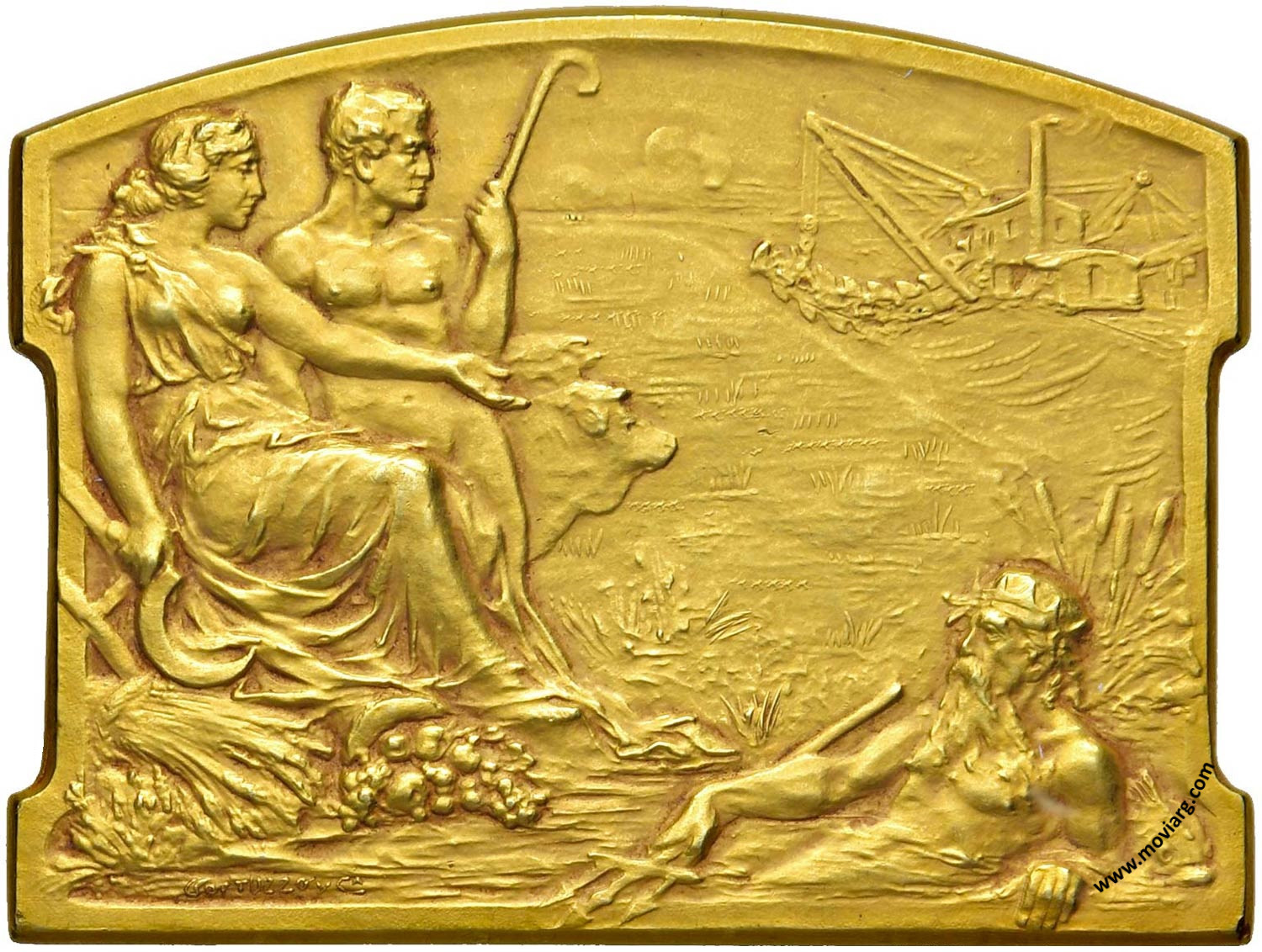 | Año: 1913 Obras y Servicios Públicos Metal: Oro - Peso: 87.17gr - Módulo: 47x63mm - Rotación: 12hrs Grabador: Juan Gottuzzo y Ca. | |