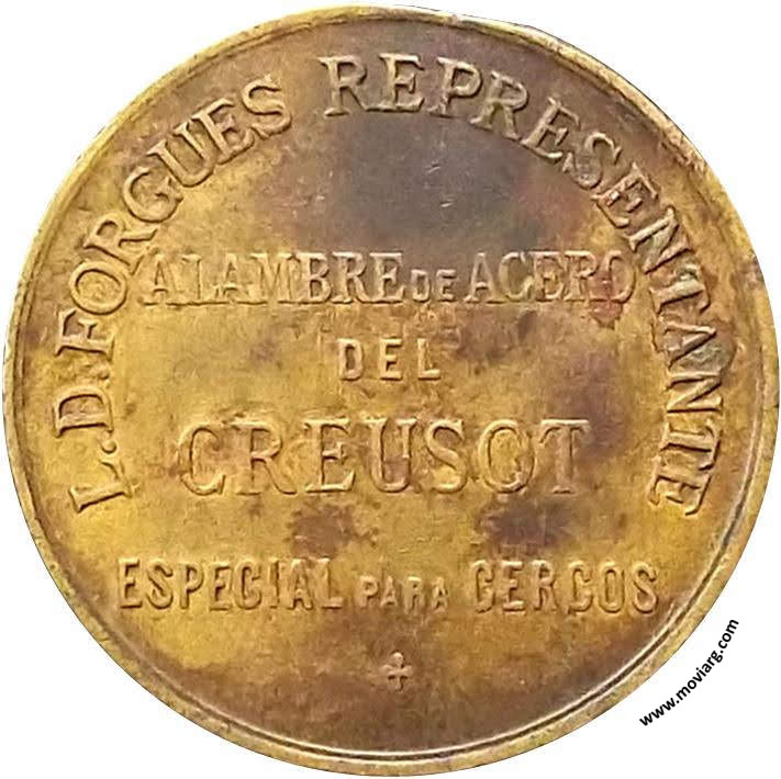 Anverso: EXPOSICION CONTINENTAL / SCHNEIDER & CIA. / USINAS DEL CREUSOT / FRANCIA / BUENOS-AIRES 1880 Reverso: L.D. FORGUES REPRESENTANTE / ALAMBRE DE ACERO / DEL / CREUSOT / ESPECIAL PARA CERCOS Canto: Humberto Burzio: "Buenos Aires en la medalla" 1981 p439. Referencia: BURZIO-1265 ROSA-1512 | |