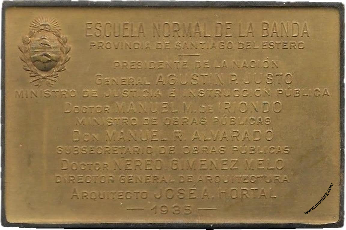 Anverso: Firma: CONSTANTE ROSSI Reverso: ESCUELA NORMAL DE LA BANDA / PROVINCIA DE SANTIAGO DEL ESTERO / PRESIDENTE DE LA NACIÓN / GENERAL AGUSTIN P. JUSTO / MINISTRO DE JUSTICIA É INSTRUCCIÓN PÚBLICA / DOCTOR MANUEL M. DE IRIONDO / MINISTRO DE OBRAS PÚBLICAS / DON MANUEL R. ALVARADO / SUBSECRETARIO DE OBRAS PÚBLICAS / DOCTOR NEREO GIMENEZ MELO / DIRECTOR GENERAL DE ARQUITECTURA / ARQUITECTO JOSÉ A. HORTAL / 1935 Referencia: | |