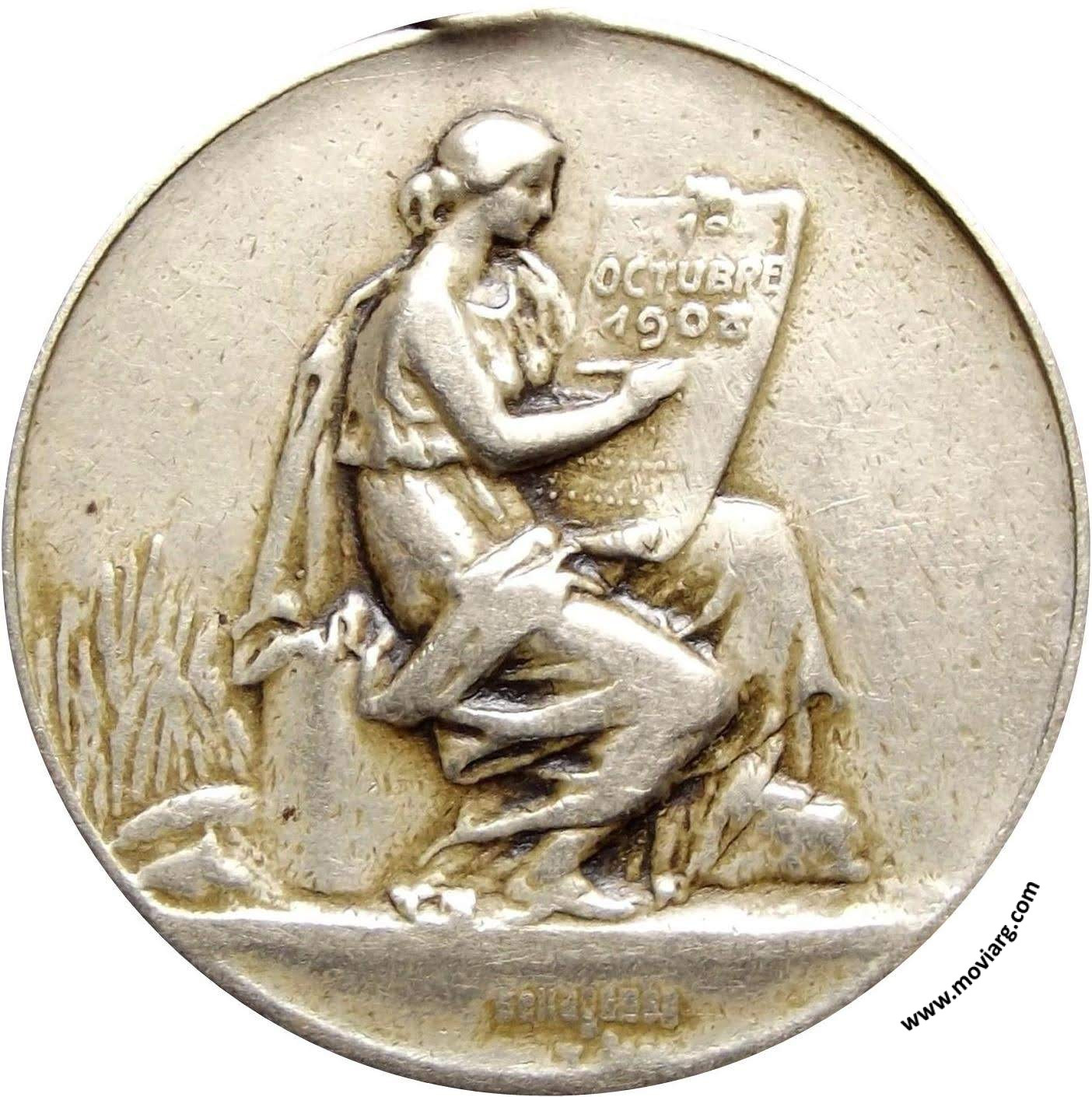 | Año: 1908 Obras y Servicios Públicos Metal: Plateado - Peso: 10.39gr - Módulo: 31mm Grabador: José Bellagamba y Constante Rossi | |