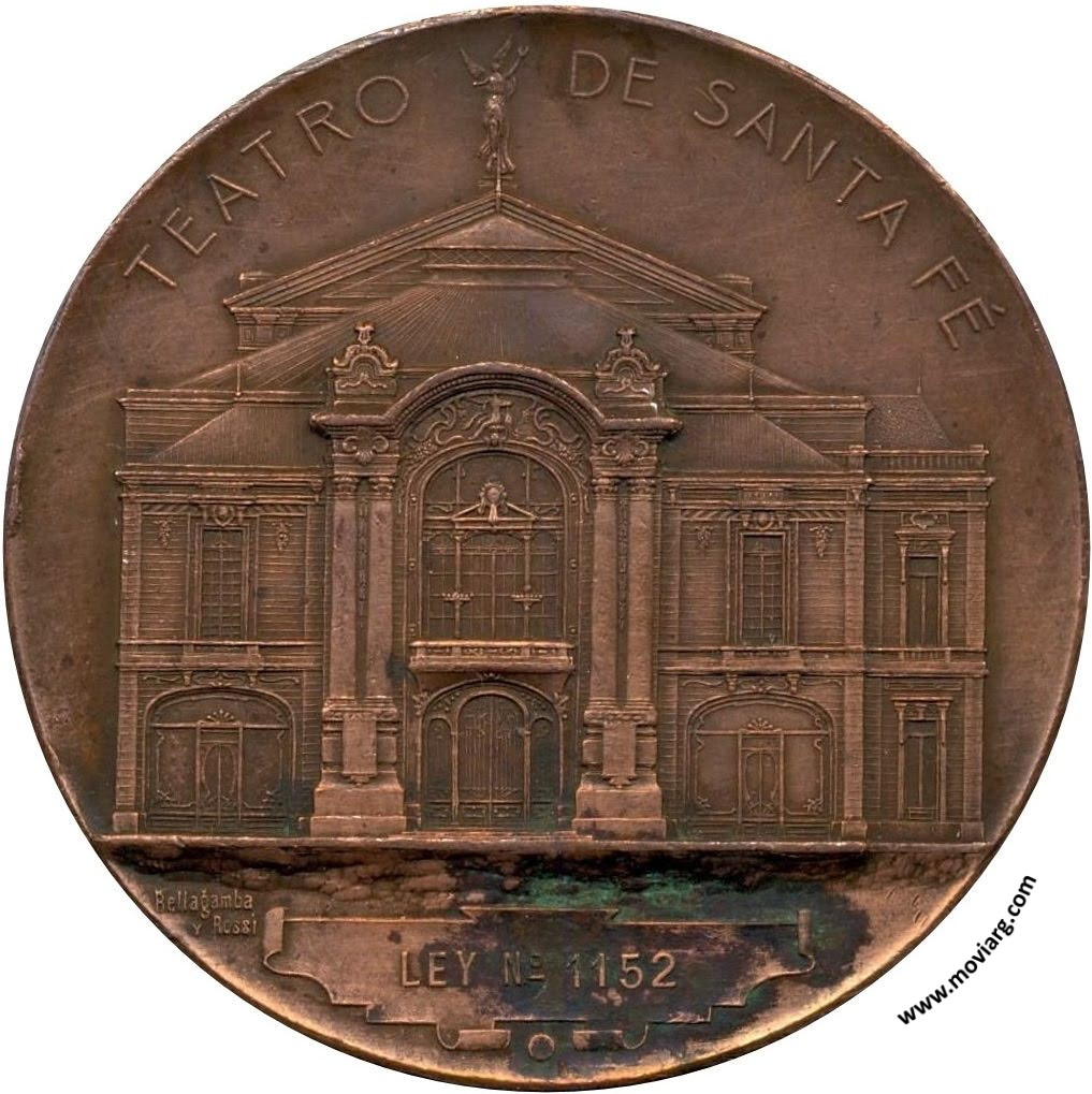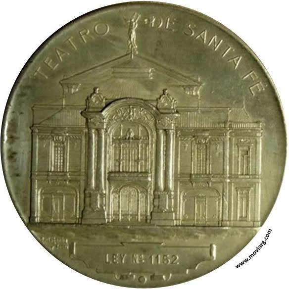 Anverso: TEATRO / DE SANTA FÉ / LEY N° 1152. Firma: BELLAGAMBA / Y ROSSI Reverso: INAUGURACION / OCTUBRE / 5 DE 1905 / GOBERNADOR / DR. RODOLFO FREYRE / MINISTRO DE OBRAS PUBLICAS / DR. JULIAN V. PERA / INTENDENTE MUNICIPAL / D. MANUEL IRIGOYEN Referencia: | |