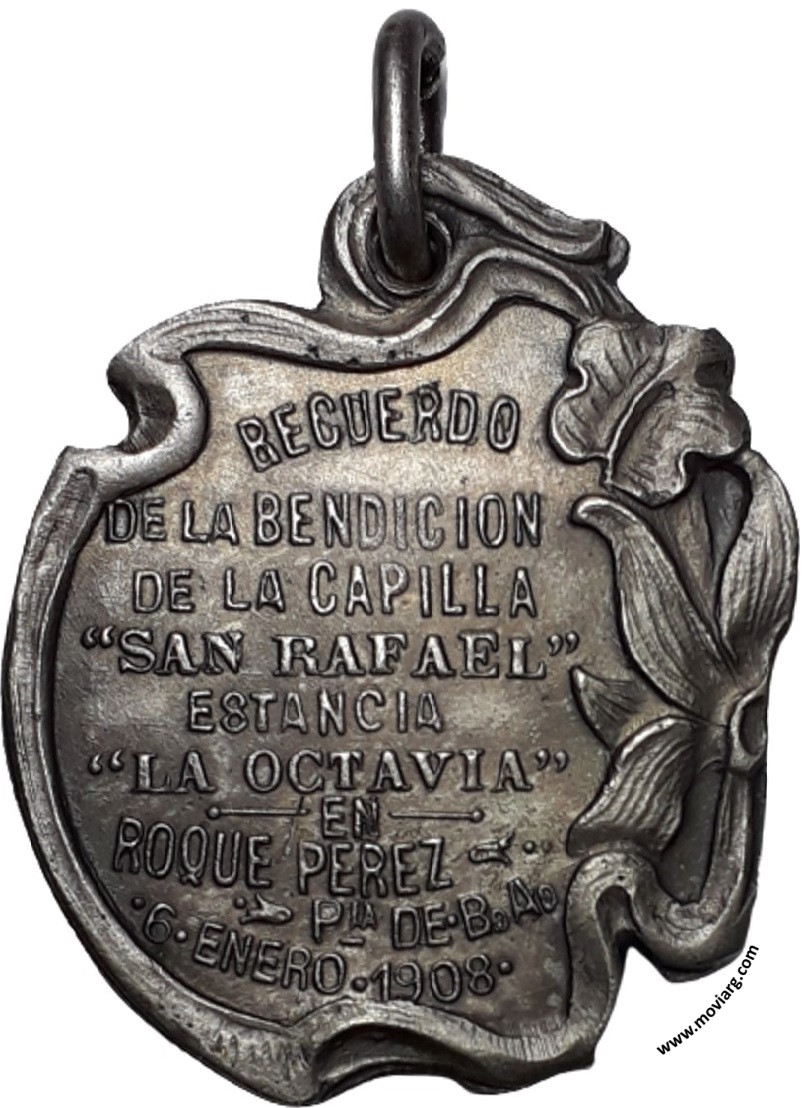 Colección MDS Anverso:Reverso: RECUERDO / DE LA BENDICION / DE LA CAPILLA / " SAN RAFAEL " / ESTANCIA / " LA OCTAVIA " / EN / ROQUE PEREZ / PIA. DE · B. A. / 6 · ENERO · 1908 Referencia: | |