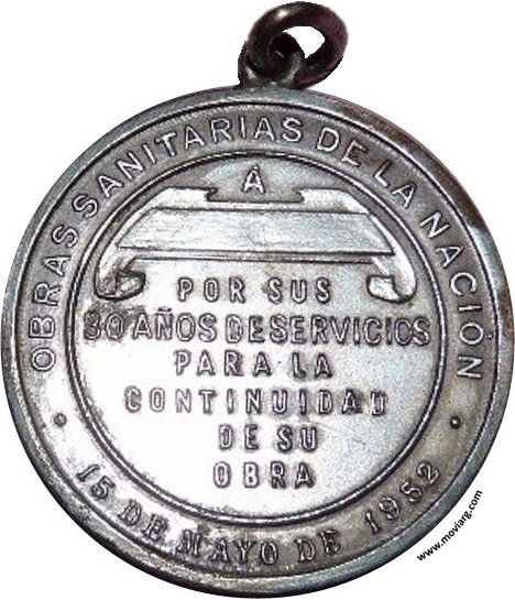 Anverso: BUENOS AIRES / 1874 Reverso: OBRAS SANITARIAS DE LA NACIÓN / 15 DE MAYO DE 1952 / A / POR SUS / 30 AÑOS DE SERVICIOS / PARA LA / CONTINUIDAD / DE SU / OBRA Canto: Liso. PLATA Referencia: | |