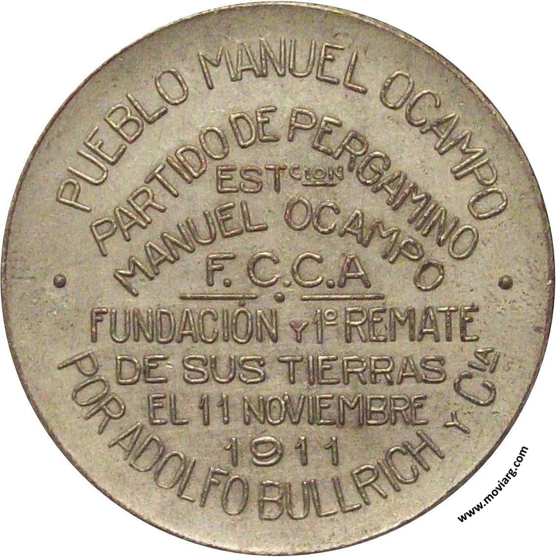 Anverso: Firma: C. Y AF. ROSSI Reverso: PUEBLO MANUEL OCAMPO / PARTIDO DE PERGAMINO / ESTCION. / MANUEL OCAMPO / F.C.C.A / FUNDACIÓN Y 1° REMATE / DE SUS TIERRAS / EL 11 NOVIEMBRE / 1911 / POR ADOLFO BULLRICH Y CIA. Referencia: | |