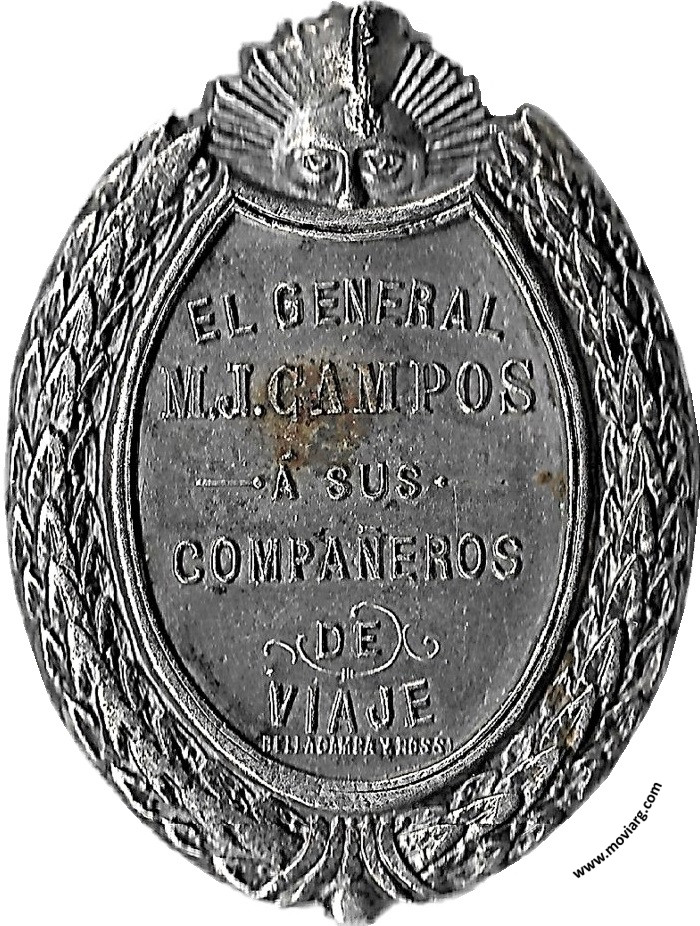 Anverso: SALTO DE YGUAZÚ / 1900 Reverso: EL GENERAL / M. J. CAMPOS / Á SUS / COMPAÑEROS / DE / VIAJE. Firma: BELLAGAMBA Y ROSSI Referencia: | |