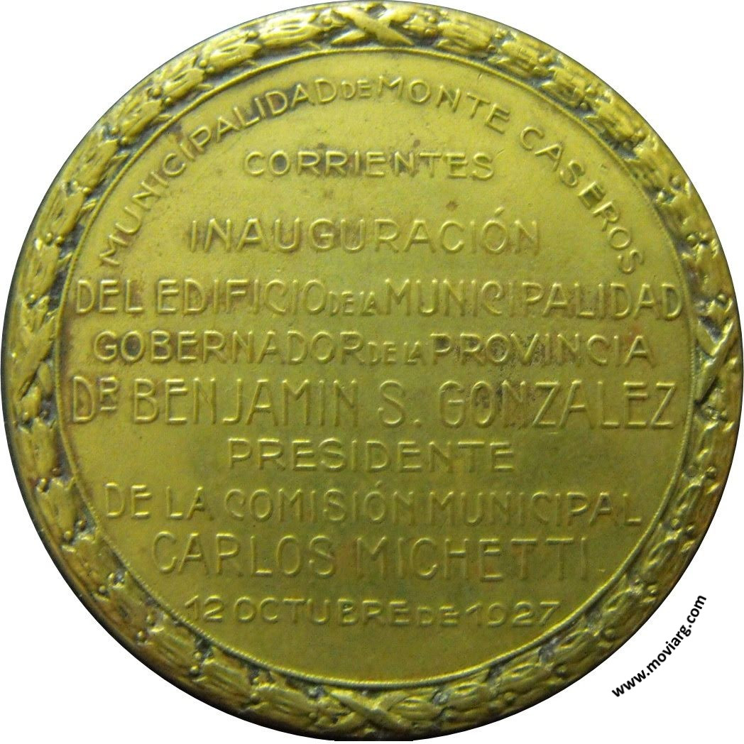 Anverso: Firma: GOTTUZZO Y PIANA Reverso: MUNICIPALIDAD DE MONTE CASEROS / CORRIENTES / INAUGURACIÓN / DEL EDIFICIO DE LA MUNICIPALIDAD / GOBERNADOR DE LA PROVINCIA / DR. BENJAMIN S. GONZALEZ / PRESIDENTE / DE LA COMISIÓN MUNICIPAL / CARLOS MICHETTI / 12 OCTUBRE DE 1927 Referencia: | |