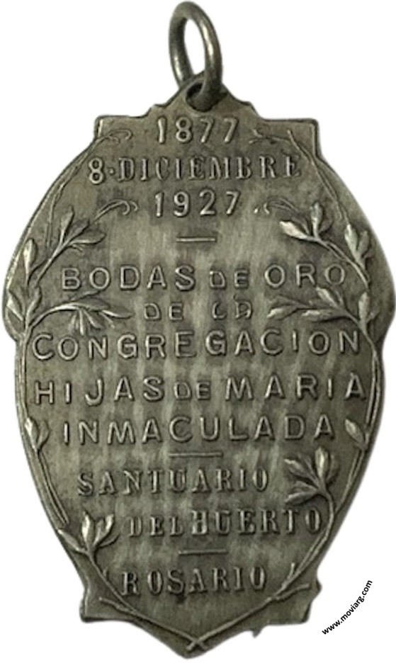 Anverso: Firma: VANZO Y GALLO Reverso: 1877 / 8 DICIEMBRE / 1927 / BODAS DE ORO / DE LA / CONGREGACION / HIJAS DE MARIA / INMACULADA / SANTUARIO / DEL HUERTO / ROSARIO Referencia: | |