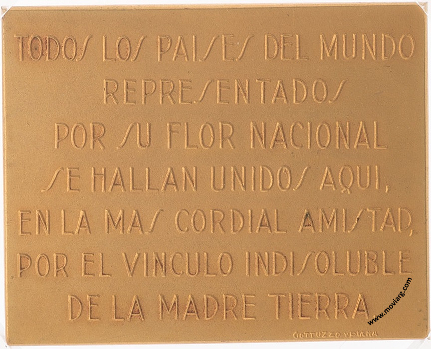 Heritage Anverso: CEIBO / FLOR NACIONAL / ARGENTINA / JARDIN DE LA PAZ / LA PLATA - REPUBLICA ARGENTINA / 19 DE NOVIEMBRE 1936 / PROYECTO DEL INGENIERO ALBERTO V. OITAVENReverso: TODOS LOS PAISES DEL MUNDO / REPRESENTADOS / POR SU FLOR NACIONAL / SE HALLAN UNIDOS AQUI, / EN LA MAS CORDIAL AMISTAD, / POR EL VINCULO INSOLUBLE / DE LA MADRE TIERRA. Firma: GOTTUZZO Y PIANA Referencia: | |