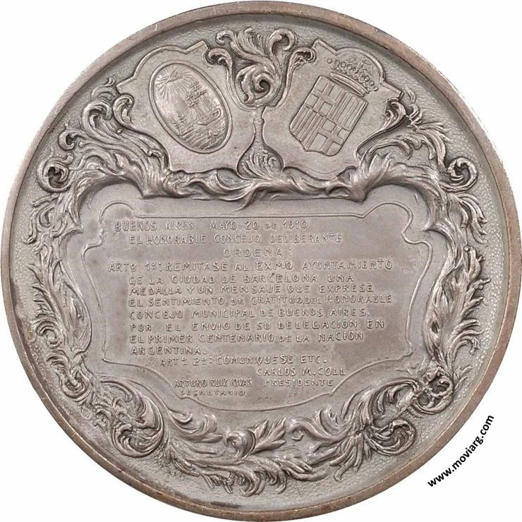 Anverso: 1810 · 25 · DE / MAYO · 1910. Firma: HORTA Y CIA. Reverso: BUENOS AIRES MAYO 20 DE 1910 / EL HONORABLE CONCEJO DELIBERANTE / ORDENA : / ART° 1°: REMITASE AL EXMO. AYUNTAMIENTO / DE LA CIUDAD DE BARCELONA UNA / MEDALLA Y UN MENSAJE QUE EXPRESE / EL SENTIMIENTO DE GRATITUD DEL HONORABLE / CONCEJO MUNICIPAL DE BUENOS AIRES. / POR EL ENVIO DE SU DELEGACION EN / EL PRIMER CENTENARIO DE LA NACION / ARGENTINA / ART° 2° COMUNIQUESE ETC. / CARLOS M COLL / PRESIDENTE / ARTURO RUIZ RIVAS / SECRETARIO Referencia: | |