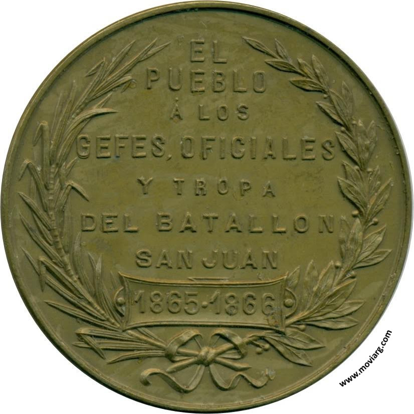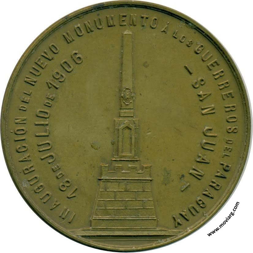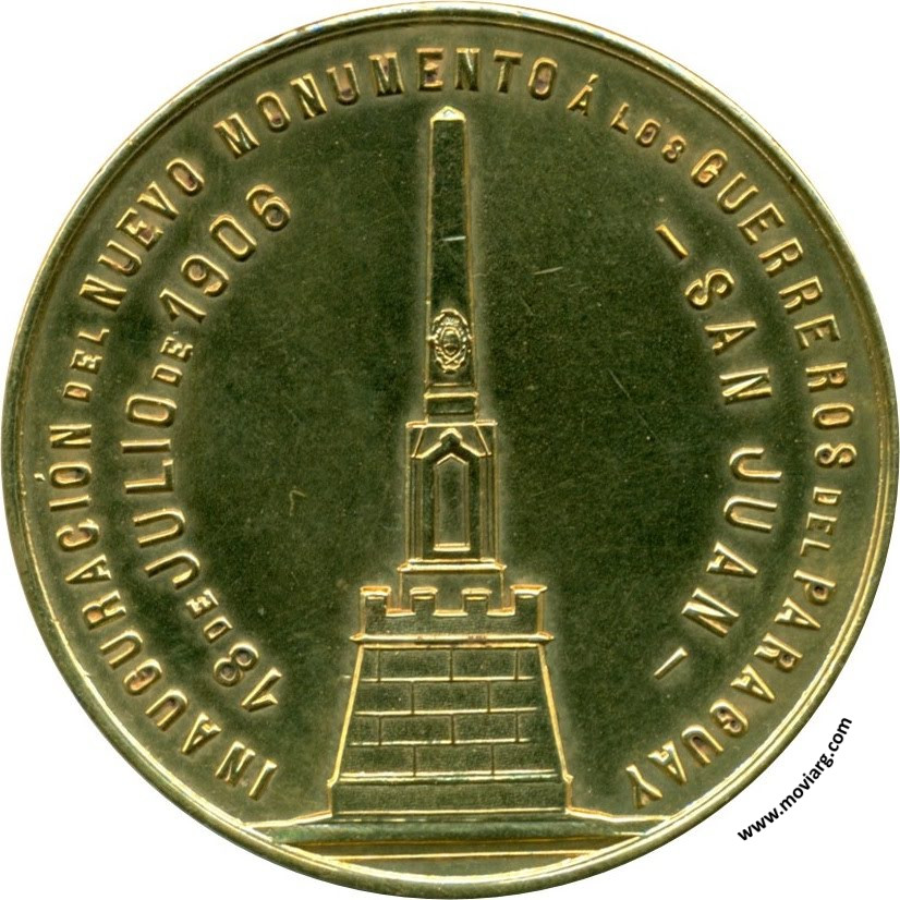 Numismática Cameroni Anverso: INAUGURACIÓN DEL NUEVO MONUMENTO Á LOS GUERREROS DEL PARAGUAY / 18 DE JULIO DE 1906 / SAN JUANReverso: EL / PUEBLO / Á LOS / GEFES, OFICIALES / Y TROPA / DEL BATALLON / SAN JUAN / 1865 · 1866 Referencia: | |
