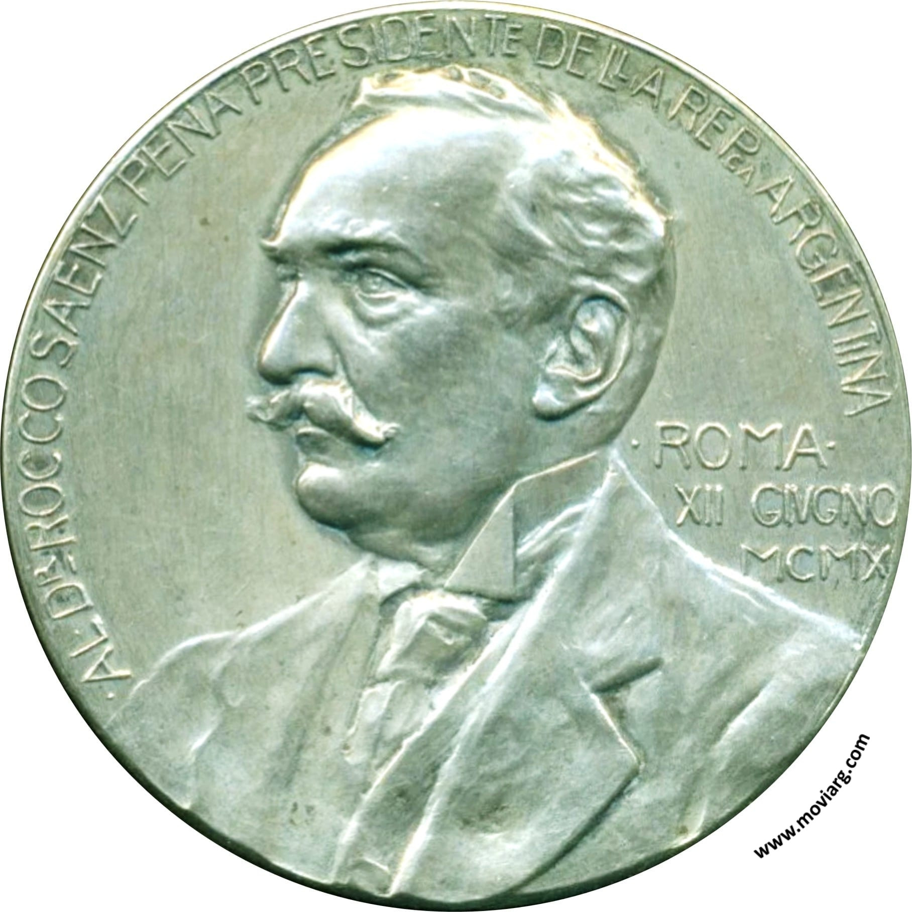 Anverso: AL DR. ROCCO SAENZ PEÑA PRESIDENTE DELLA REPCA. ARGENTINA / ROMA / XII GIUGNO / MCMX. Firma: G. C. Reverso: ¡ SEA LA AMERICA PARA LA HUMANIDAD ! / WASHINGTON 1890. Firma: M. NELLI E C. FIRENZE Referencia: | |