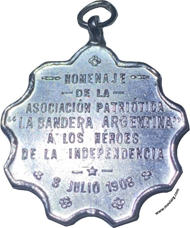 Anverso: Firma: BELLAGAMBA Y ROSSI Reverso: HOMENAJE / DE LA / ASOCIACIÓN PATRIÓTICA / "LA BANDERA ARGENTINA" / A LOS HÉROES / DE LA INDEPENDENCIA / 8 JULIO 1908 Referencia: | |