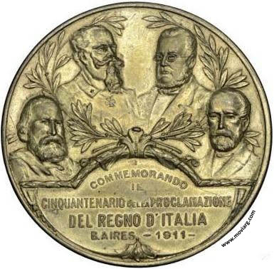 Anverso: COMMEMORANDO / IL / CINQUANTENARIO DELLA PROCLAMAZIONE / DEL REGNO D'ITALIA / B. AIRES - 1911 - Reverso: PAX ET / LABOR. Campo: SPQR. Firma: A. BIDOGLIA Referencia: BURZIO-4995 | |