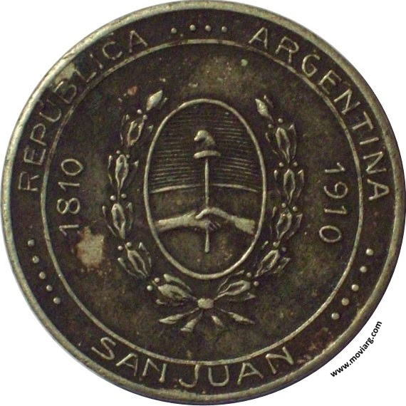 Anverso: REPÚBLICA ARGENTINA / SAN JUAN / 1810 / 1910 Reverso: CONMEMORACION / EXPOSICION CENTENARIO Referencia: | |